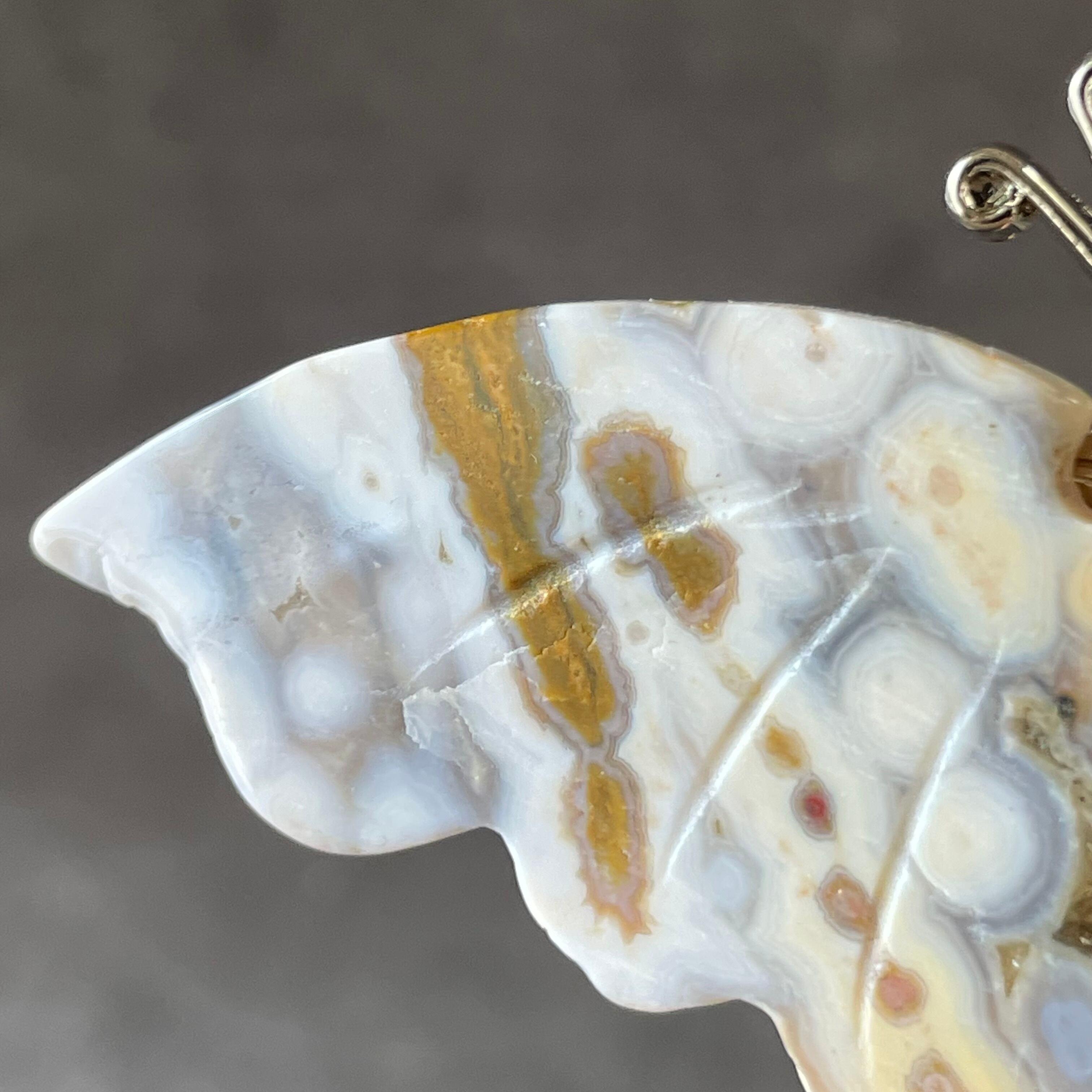 穏やかな海を思わせる模様が美しいオーシャンジャスパーを、繊細な蝶々の姿に彫刻しました。