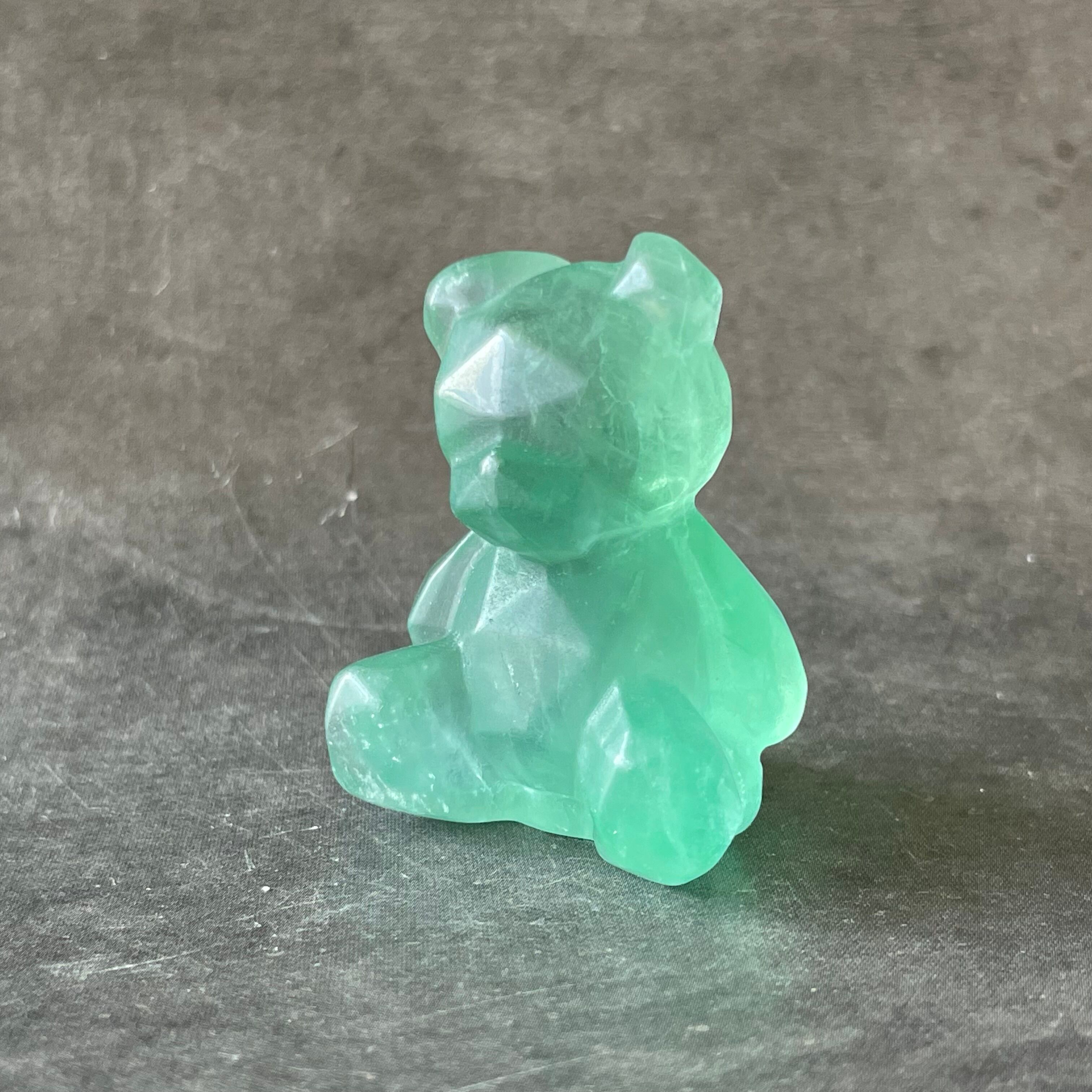 ころんとした愛らしいくまの形にカービングされたグリーンフローライト。見ているだけで癒される可愛らしさがあります。