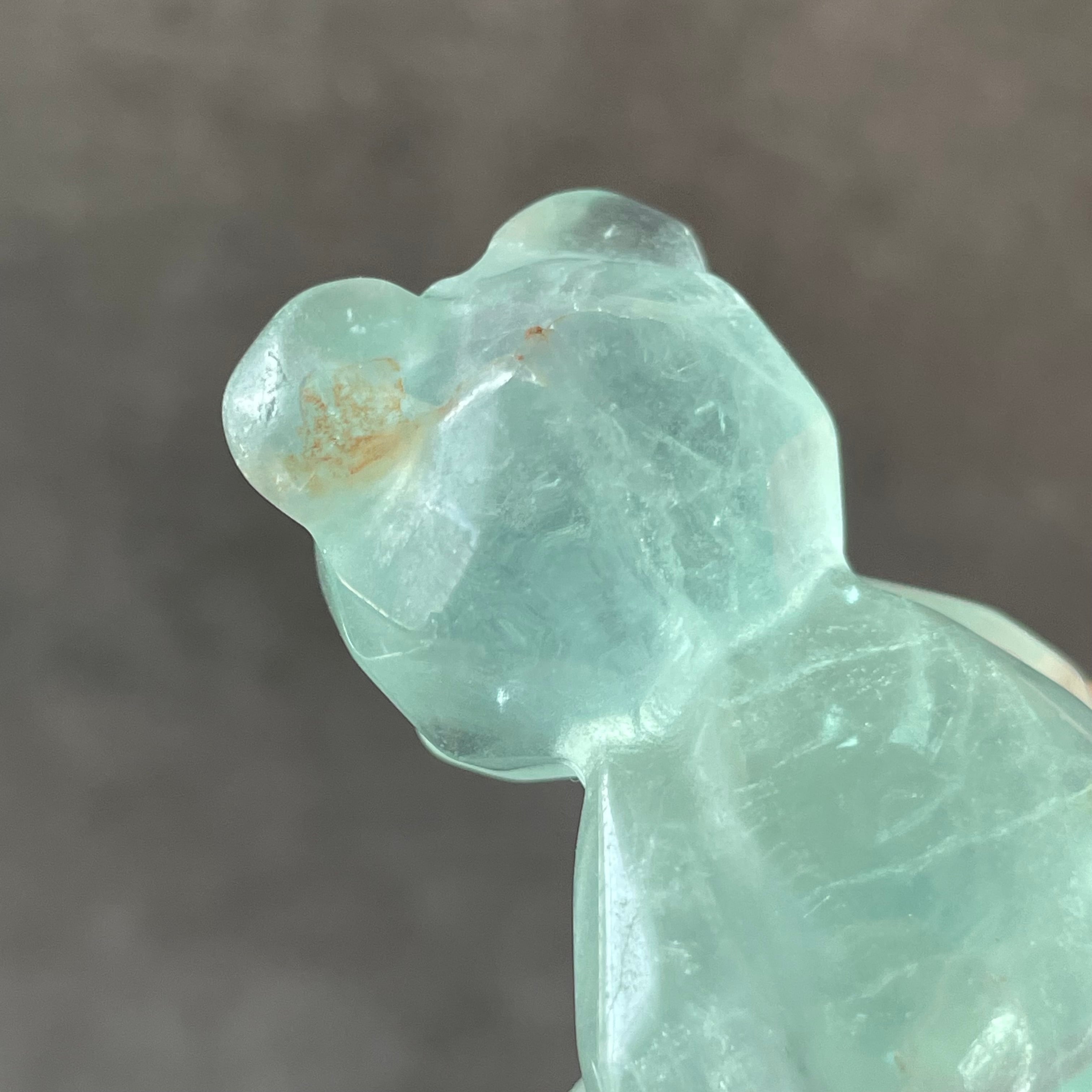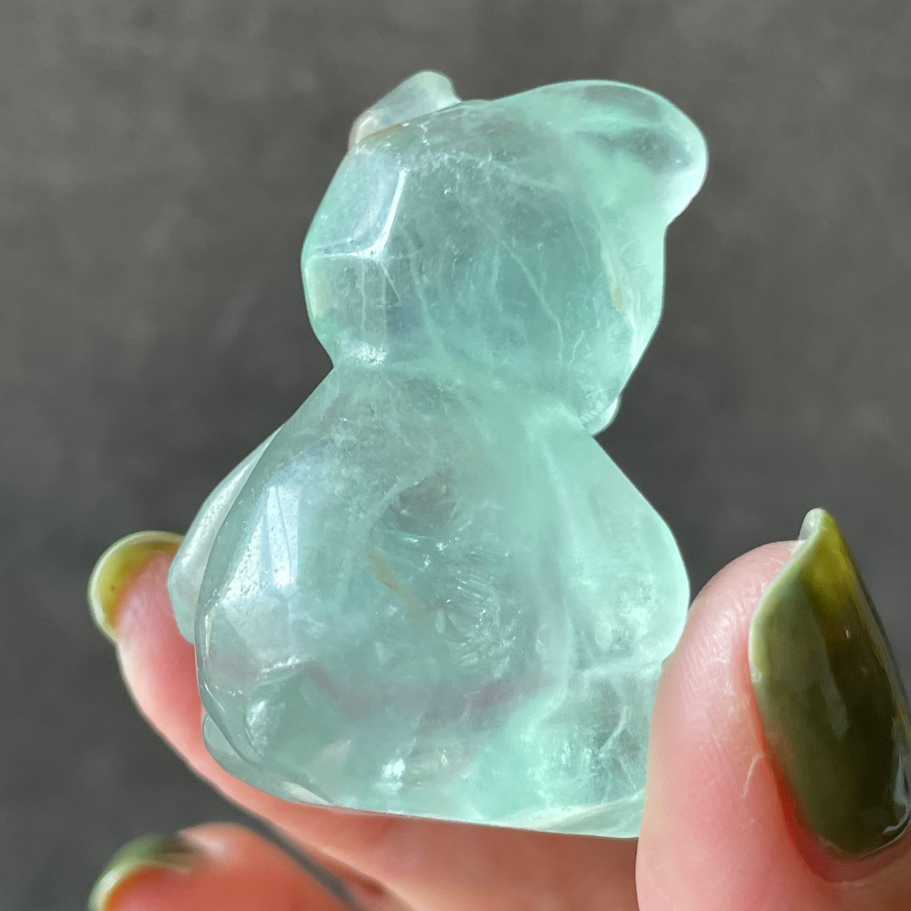 ころんとした愛らしいくまの形にカービングされたグリーンフローライト。見ているだけで癒される可愛さがあります。