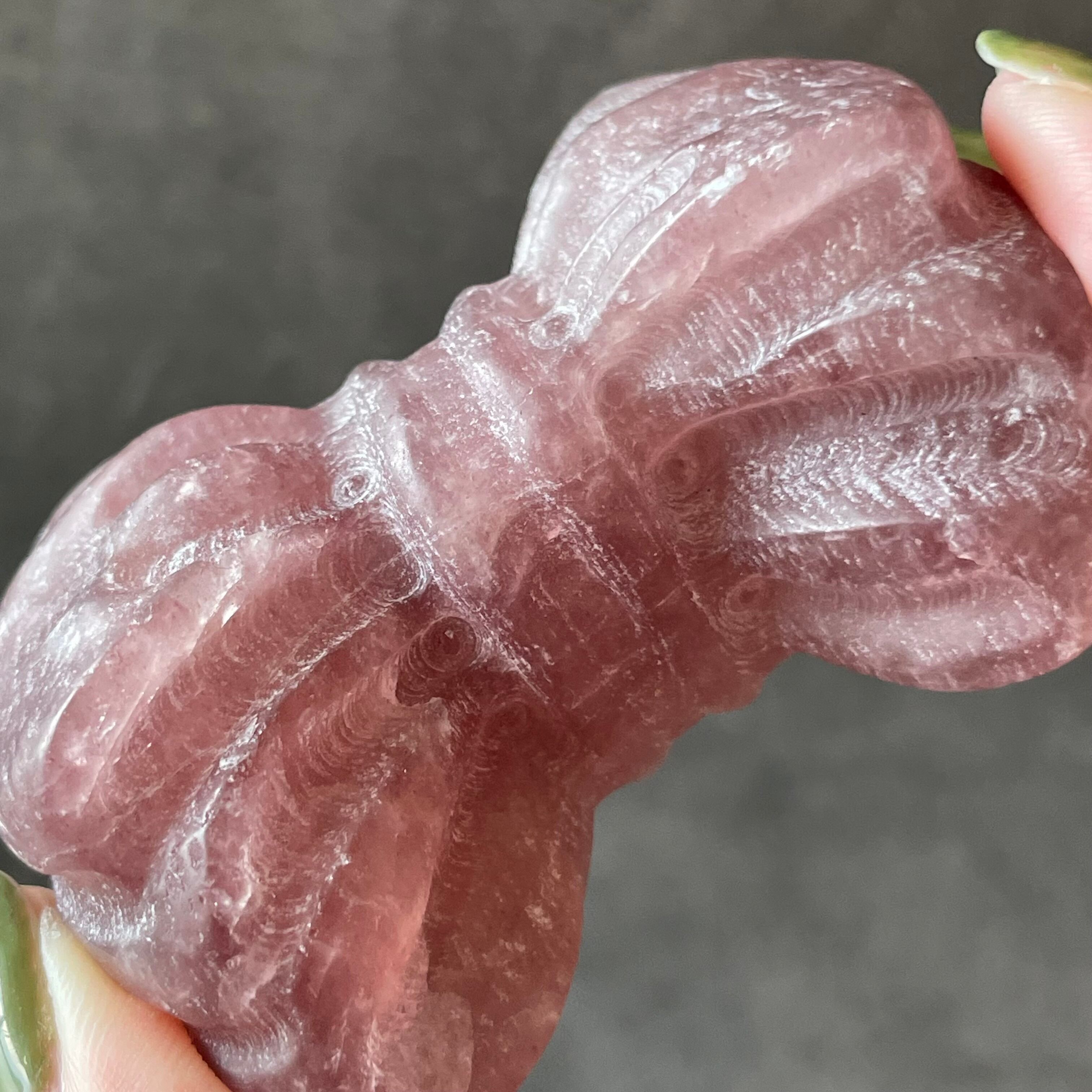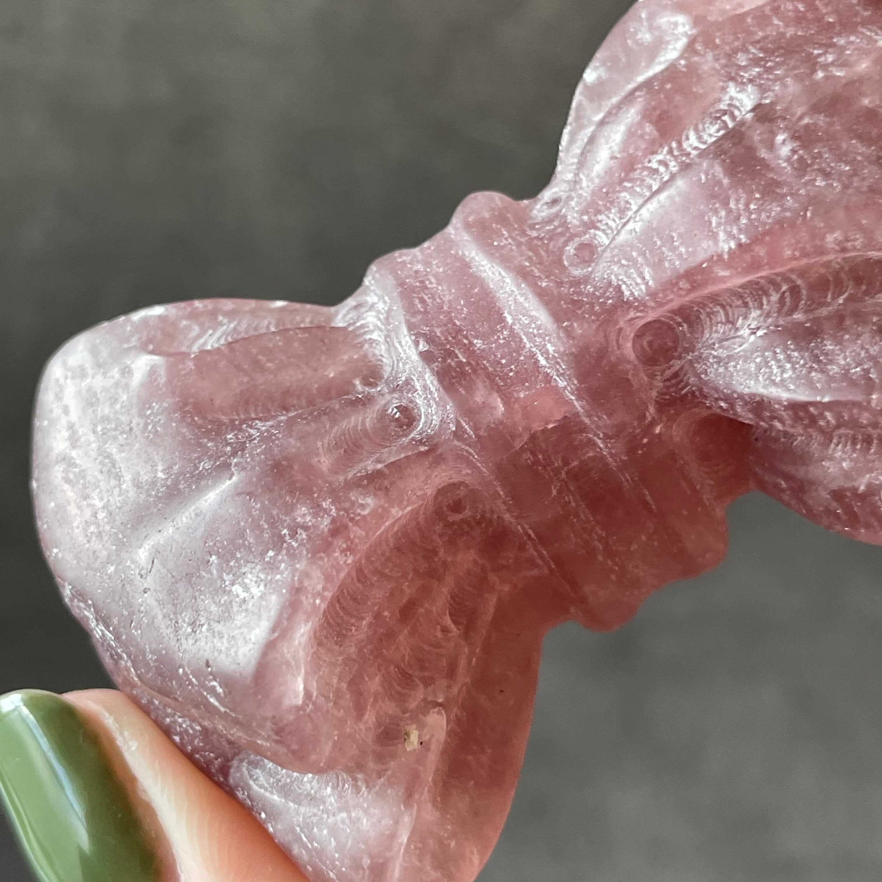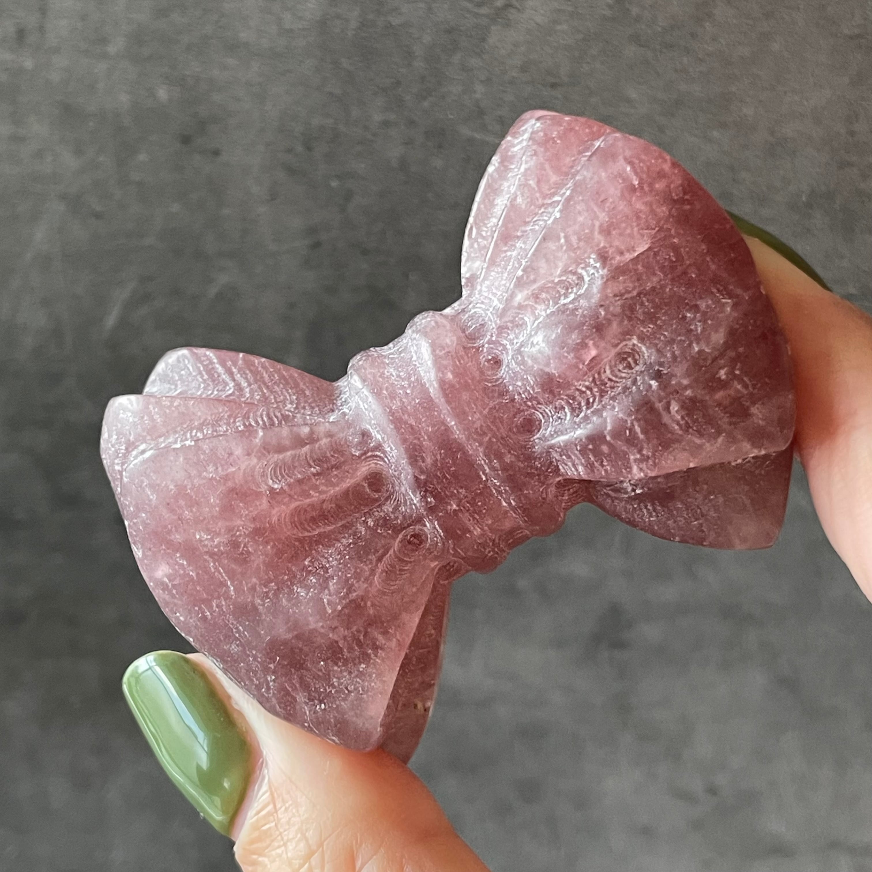 ストロベリークォーツの優しいピンクが、リボンの可憐さをより引き立てるカービング。