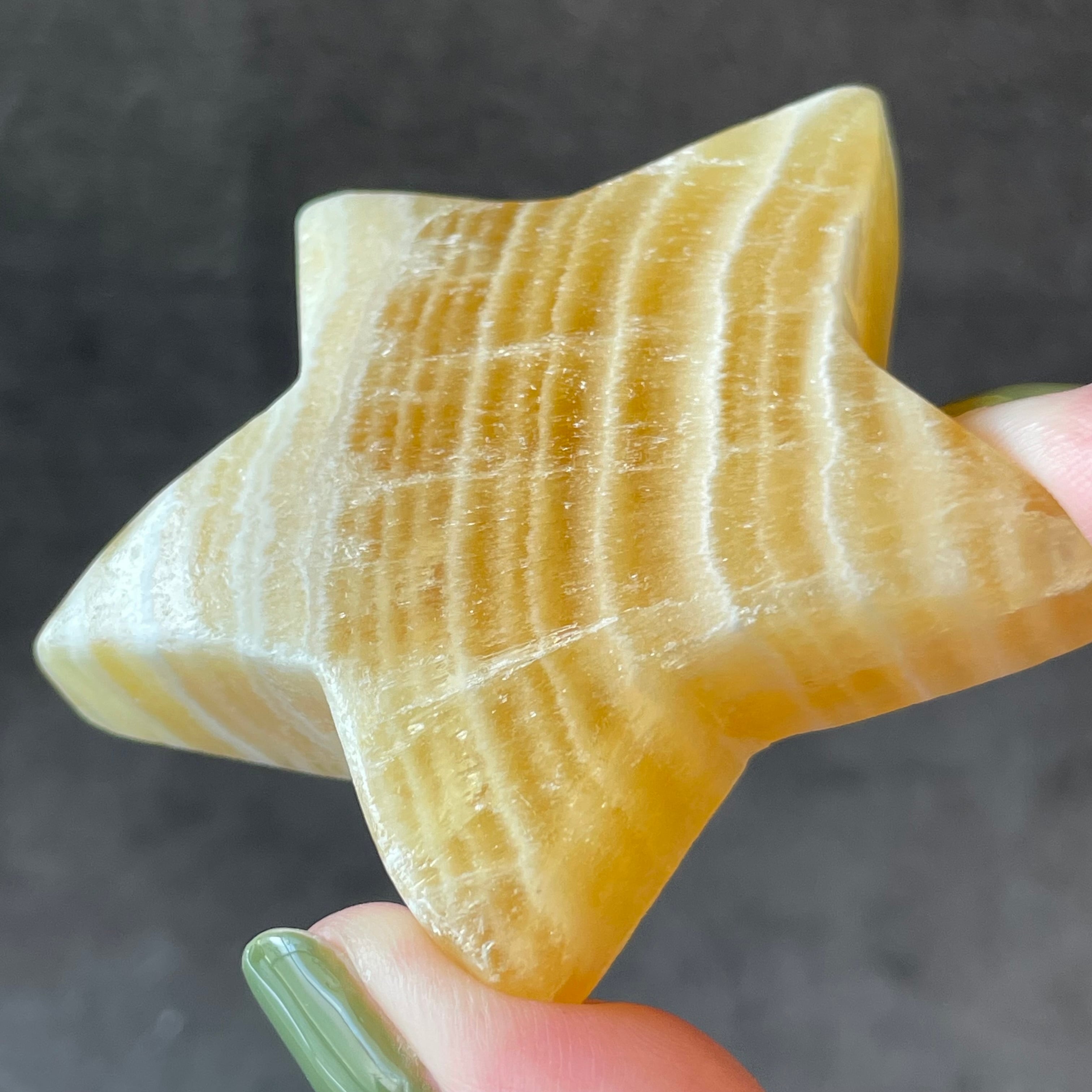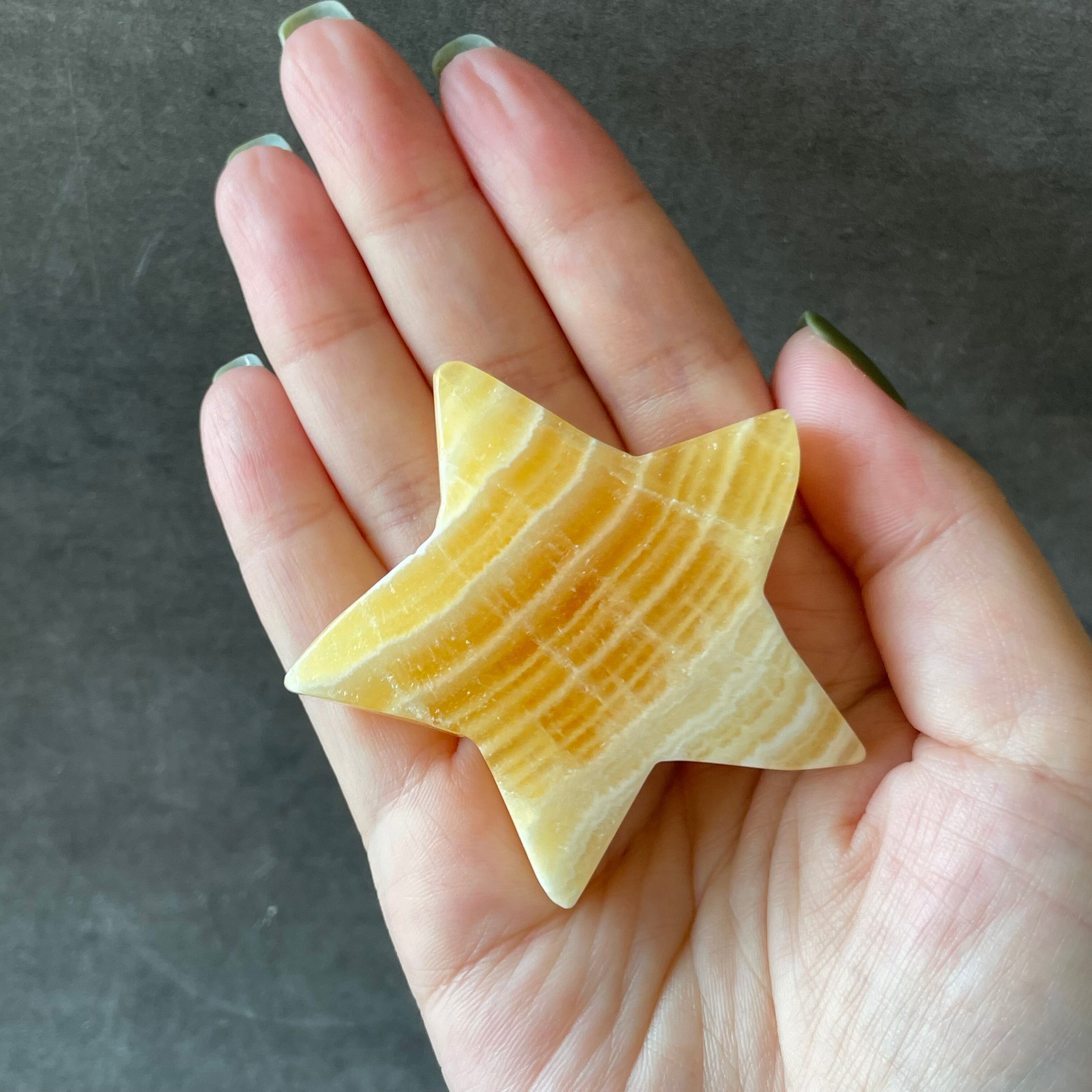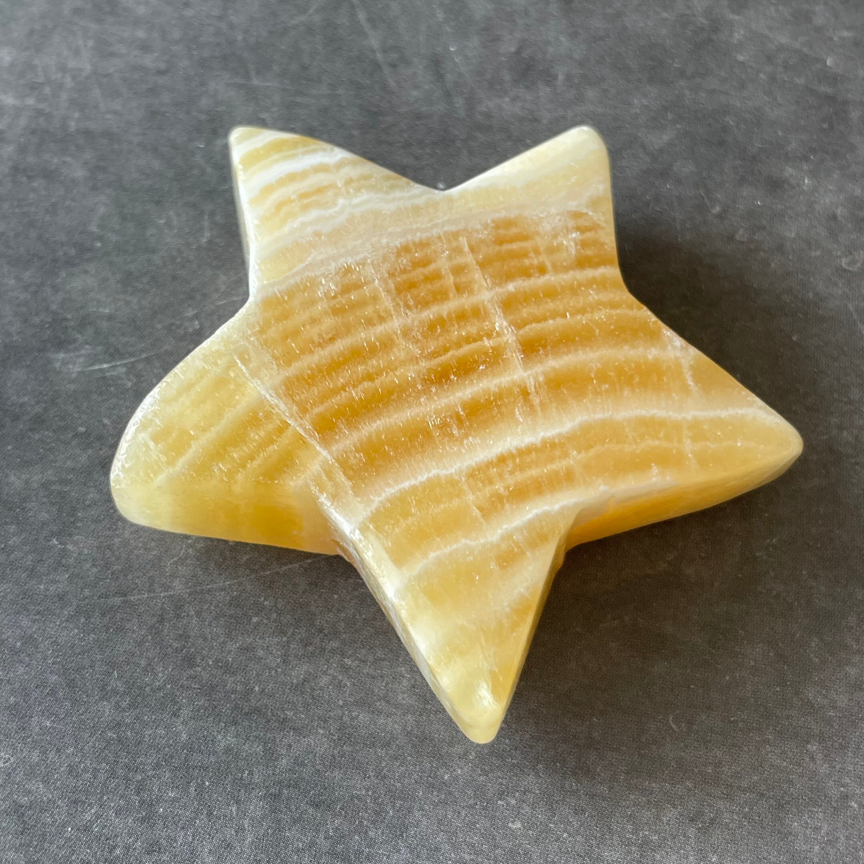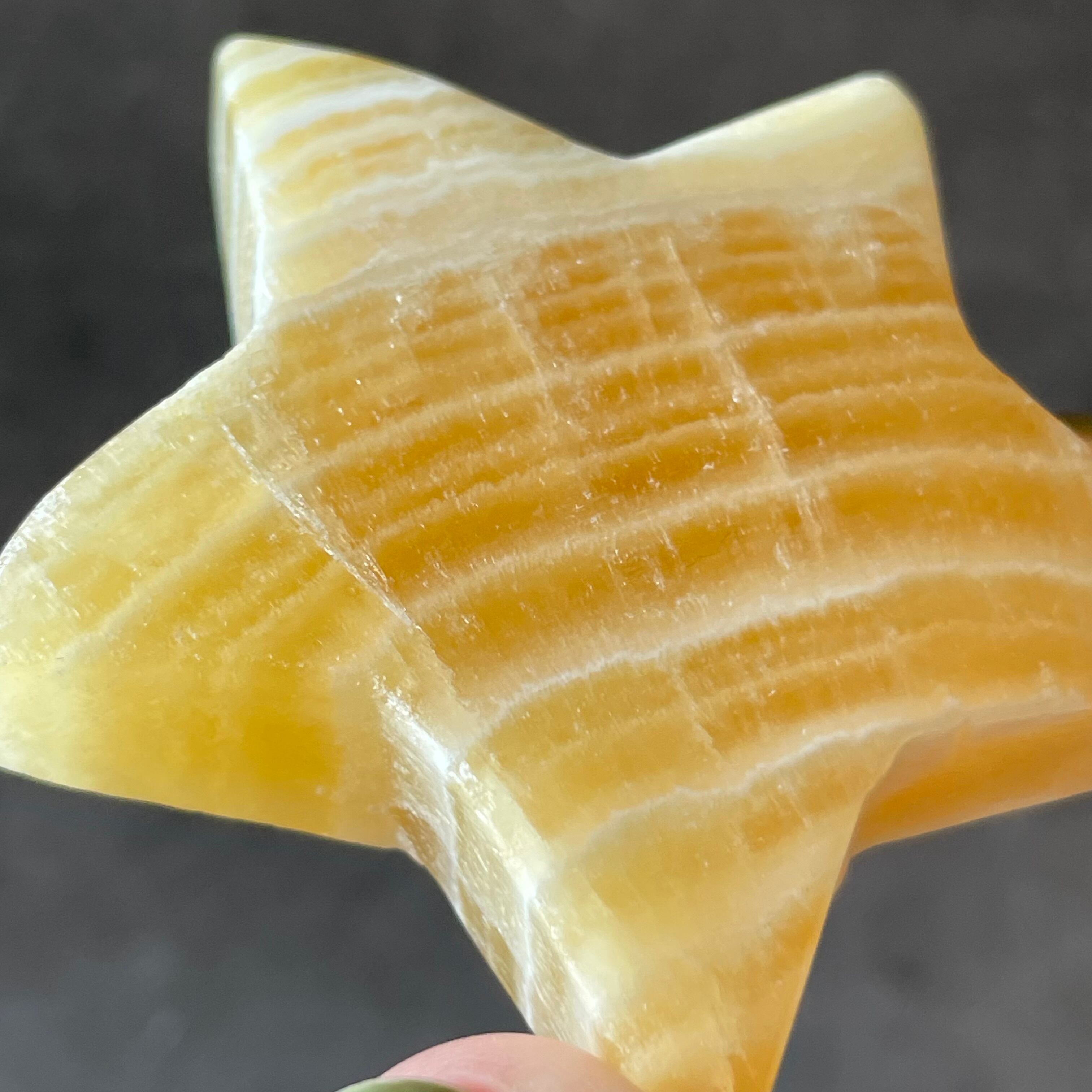 鮮やかなオレンジが印象的なカルサイトの星カービング。光を受けて透けるように輝く表情は、インテリアにも映える存在感。ポジティブなバイブレーションをまとい、日常に洗練されたアクセントを添えてくれます。