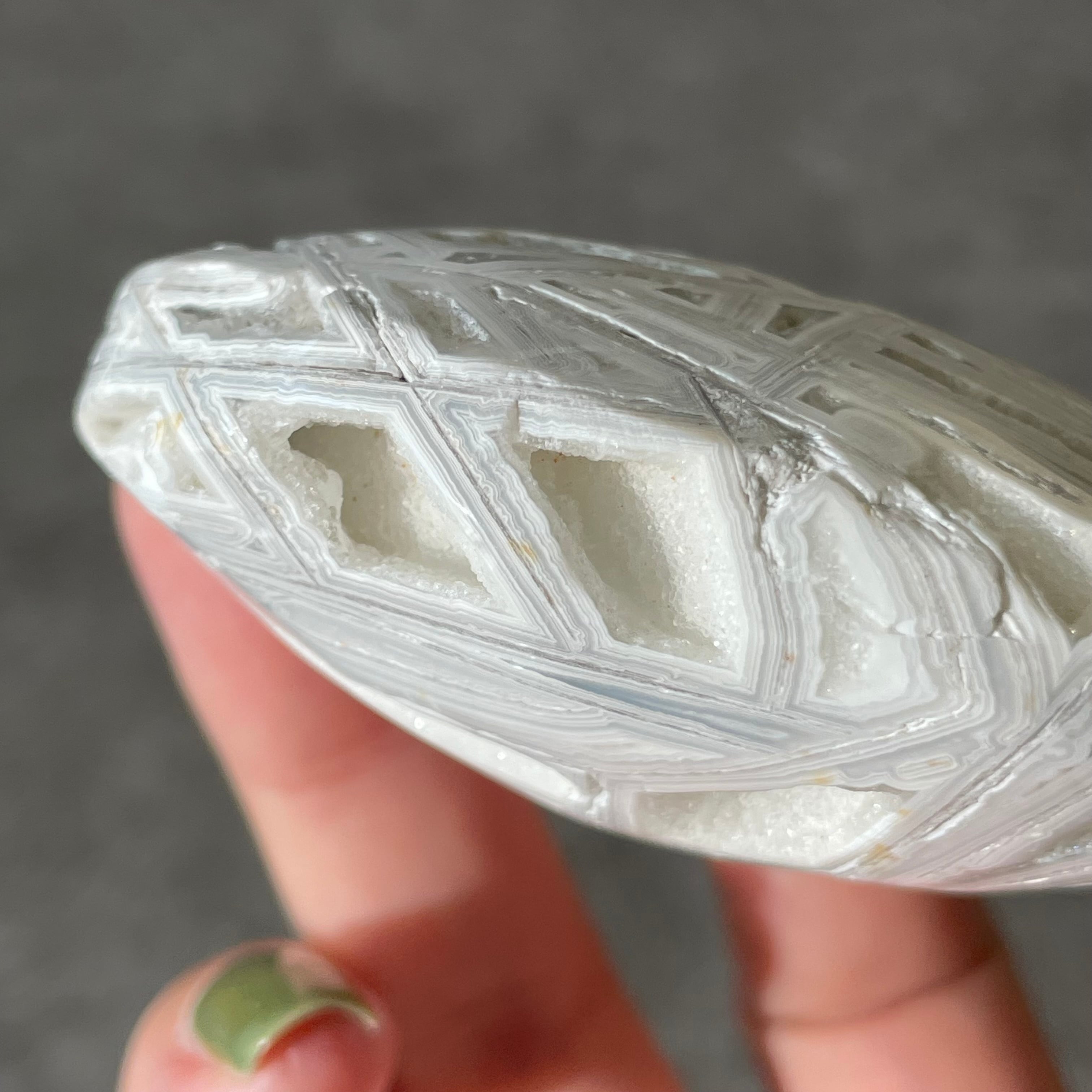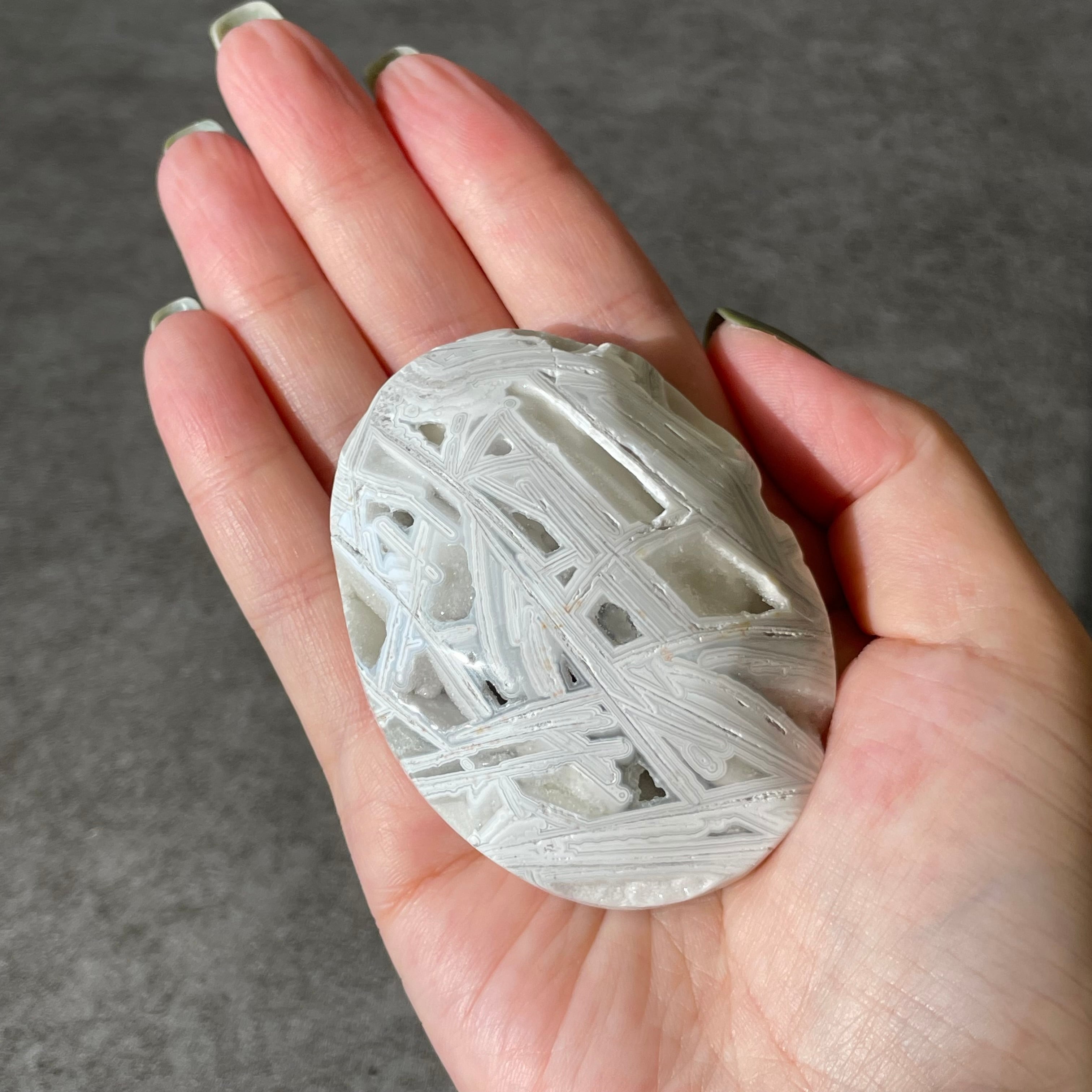 ホワイトカラーにドゥルージーがキラキラと煌めき、不思議な魅力のあるパームストーンです。