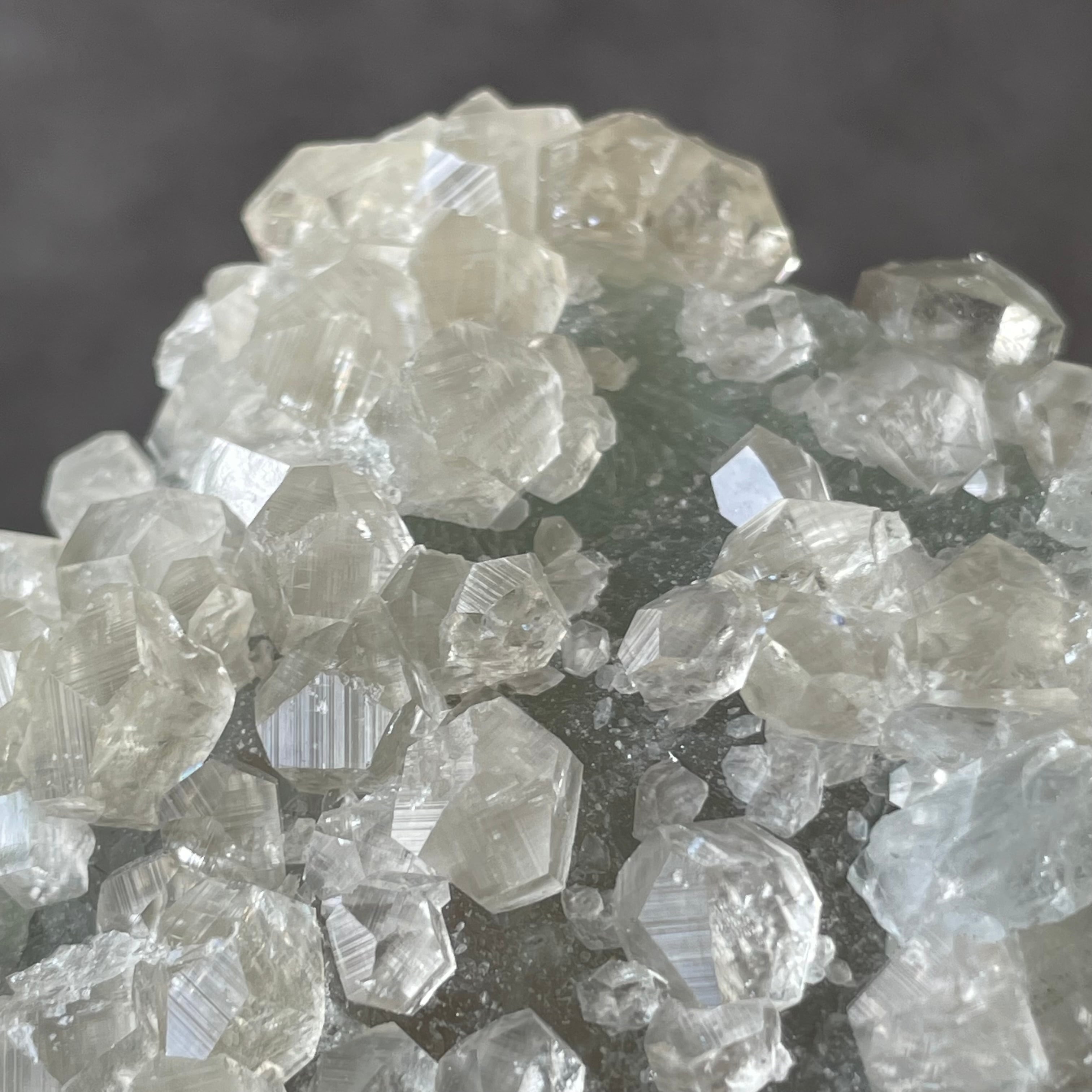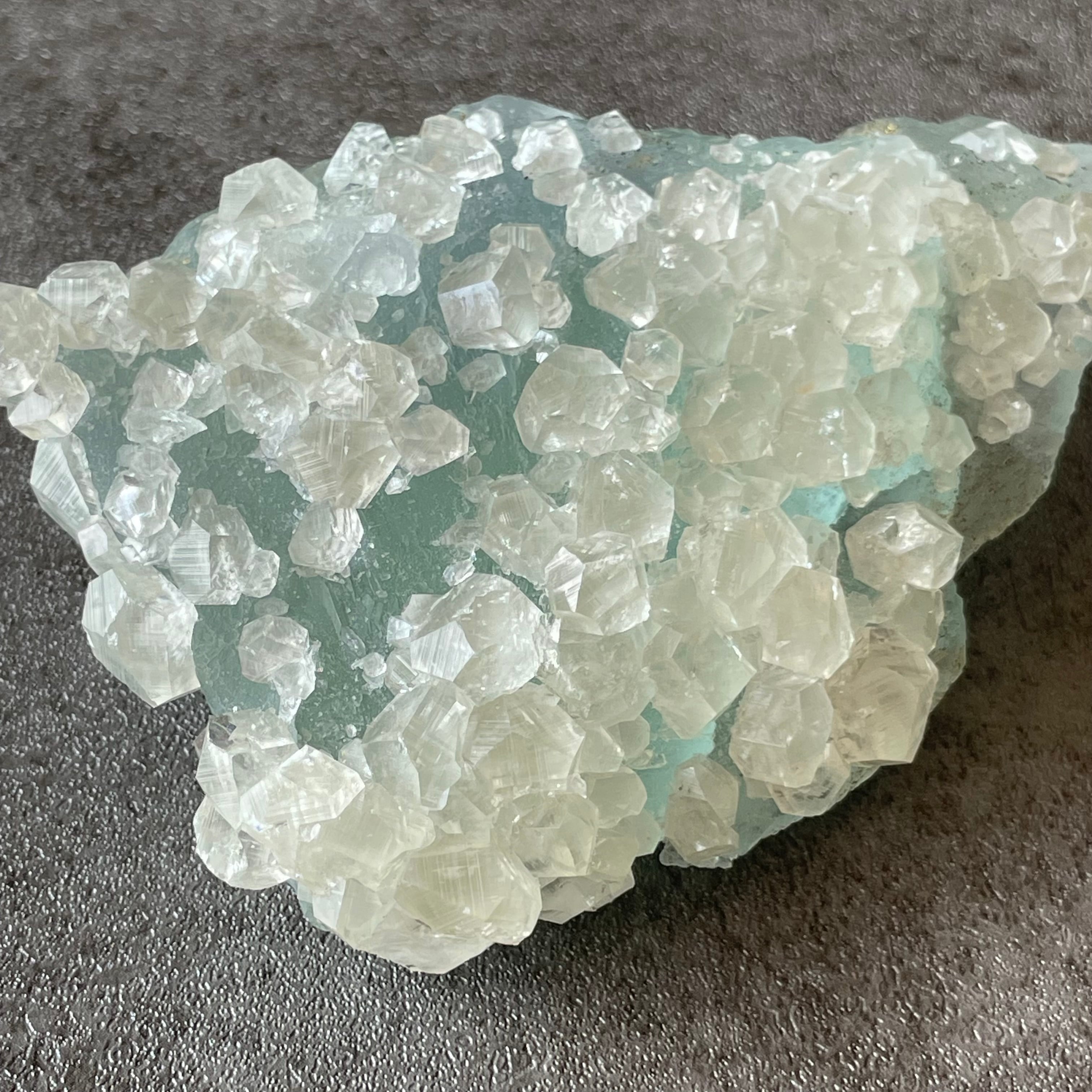 まるで海のように透き通るようなエメラルドグリーンのフローライトの上に散りばめられた、カルサイトの宝石が、光の角度によって煌めきを放ちとても美しいピース。コレクションの1つにもおすすめです。