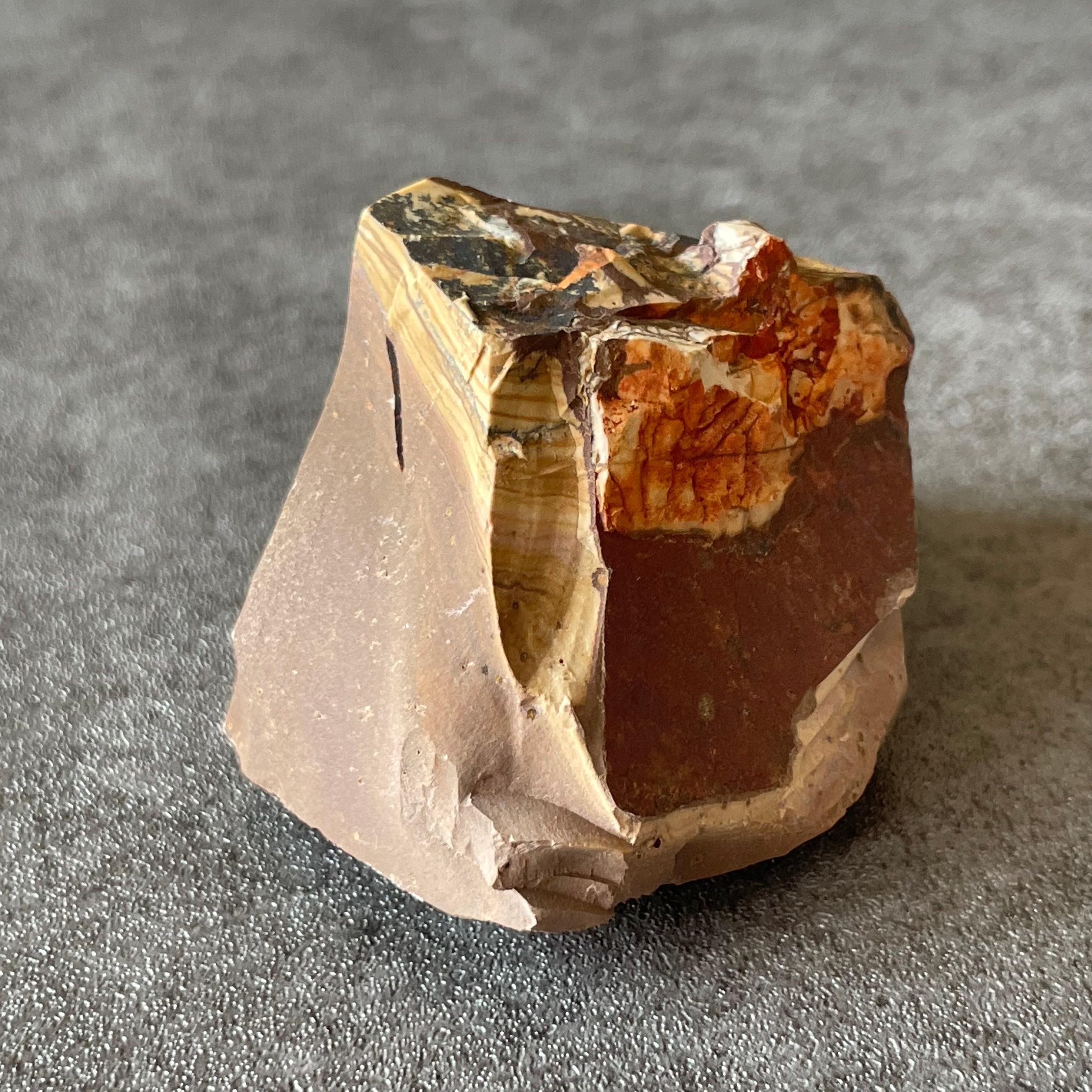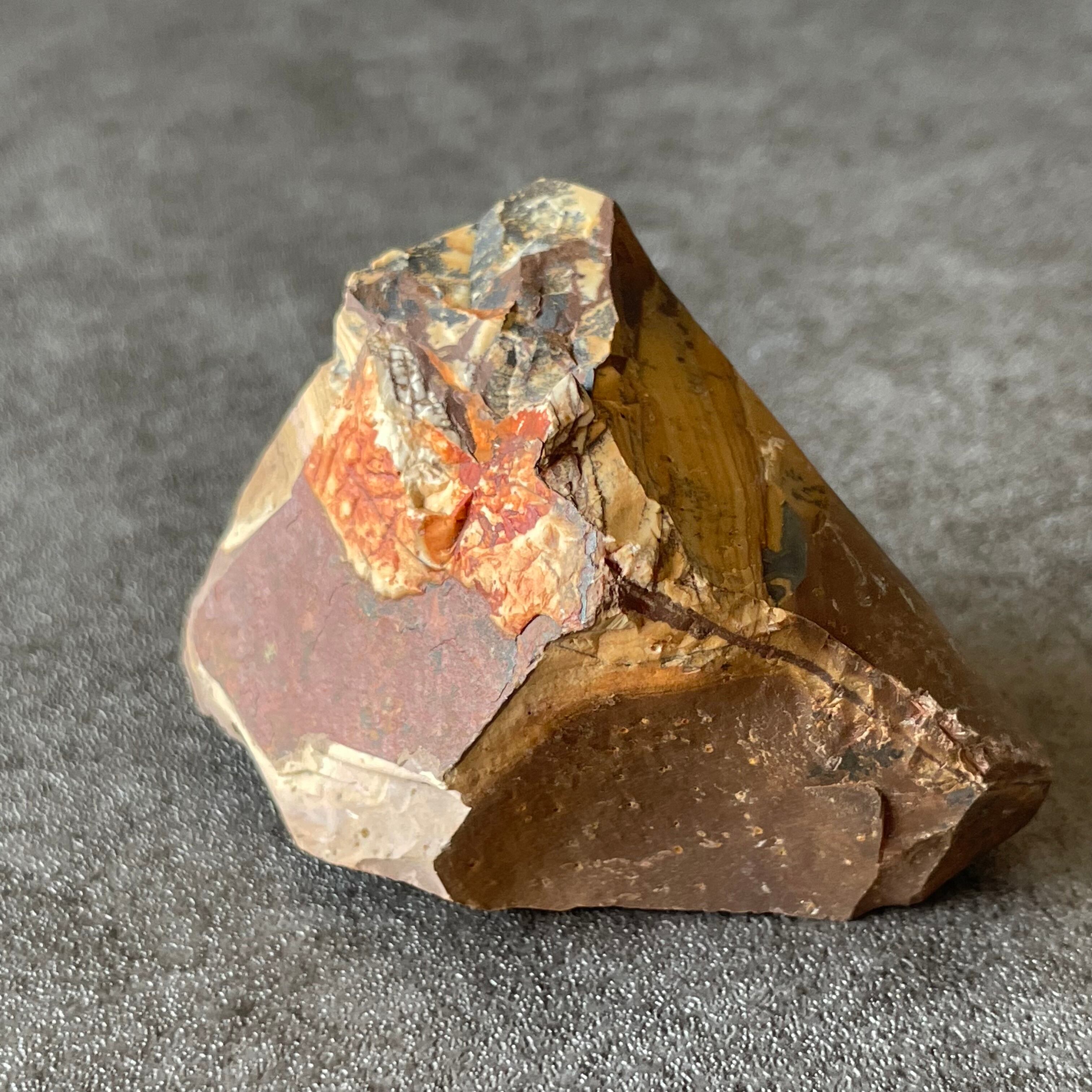 カラフルな模様が特徴で、赤・茶・黒・ベージュ・白などが層状や波模様で入り混じり、一つとして同じ模様がなく、まるで大地の景色や抽象画のような自然のアートです。