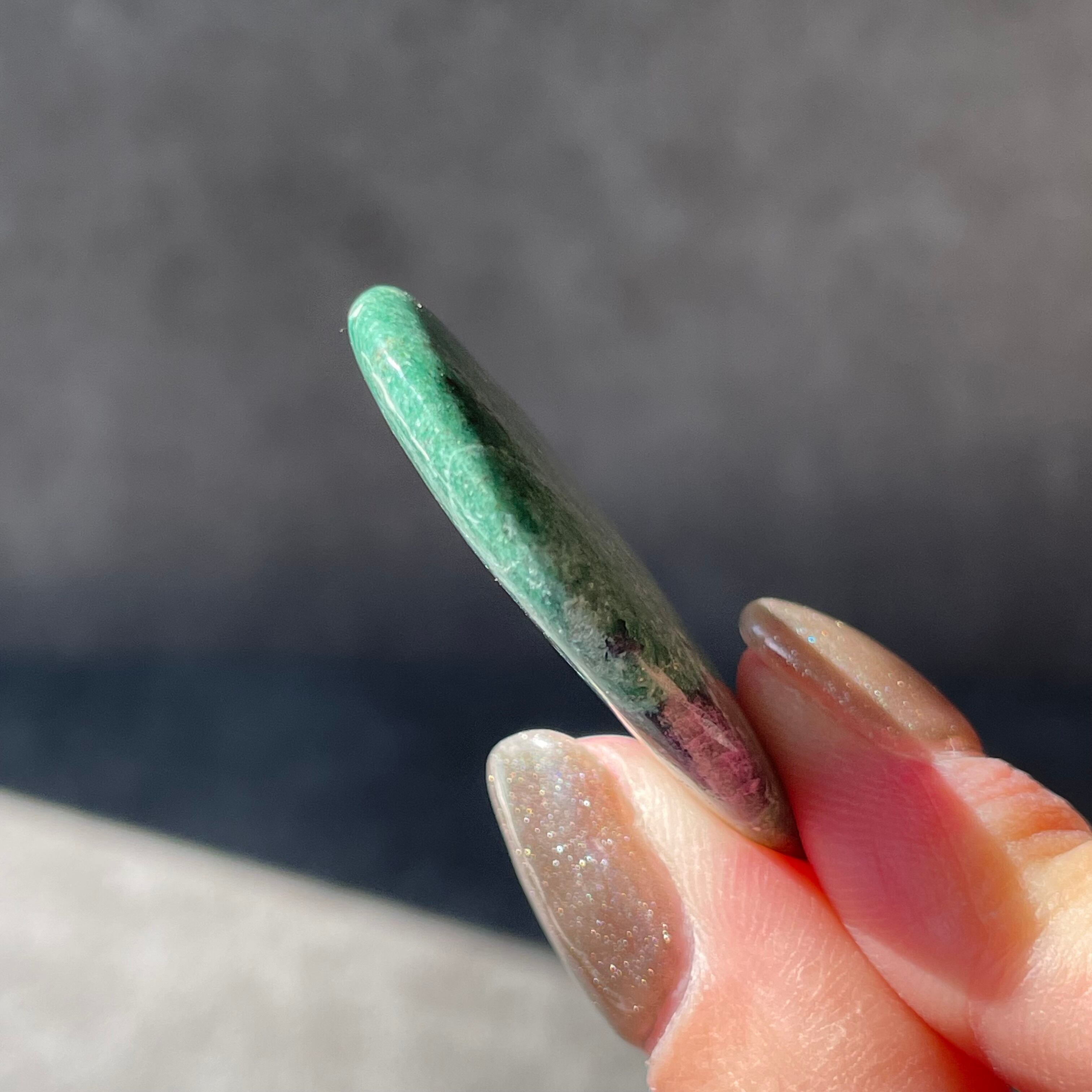 グリーンのフックサイトの中にルビーの鮮やかなピンクがひょこっと顔を出す、天然石ならではの色彩のコントラストが美しく、小さなアートピースのような存在感があります。