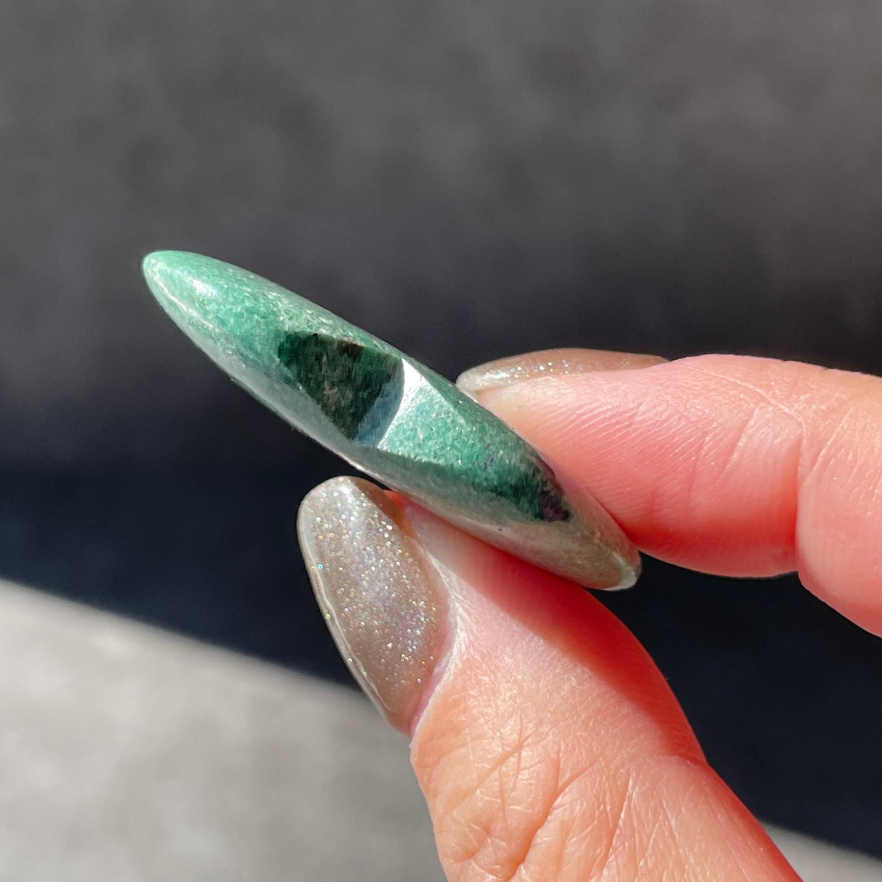 グリーンのフックサイトの中にルビーの鮮やかなピンクがひょこっと顔を出す、天然石ならではの色彩のコントラストが美しく、小さなアートピースのような存在感があります。