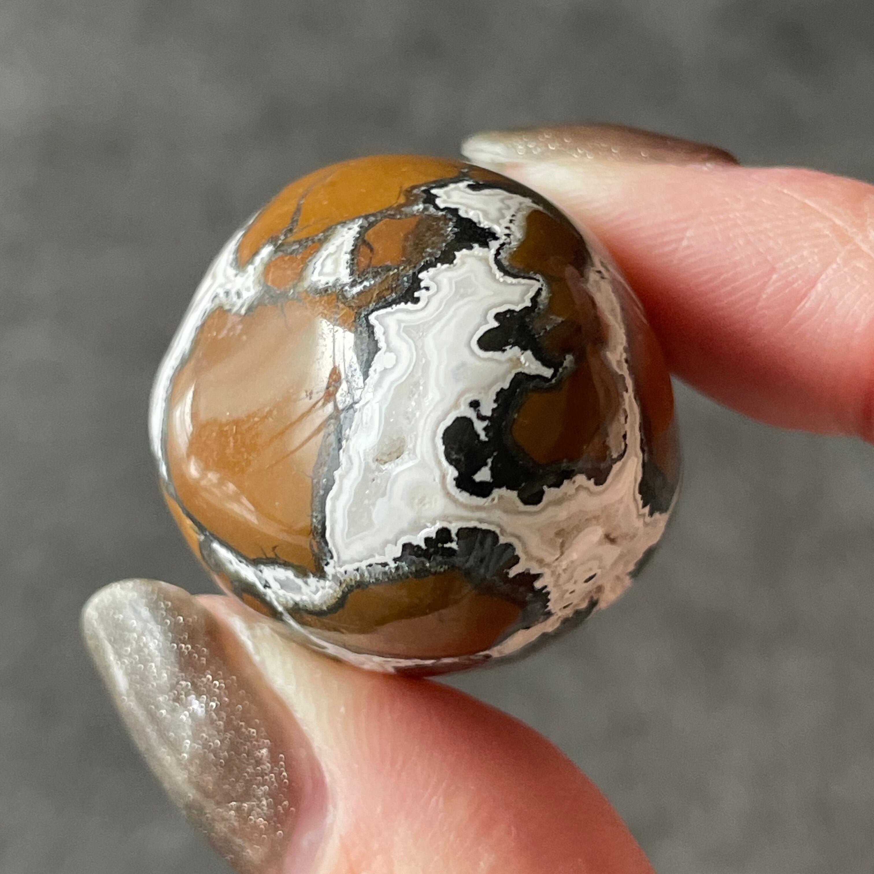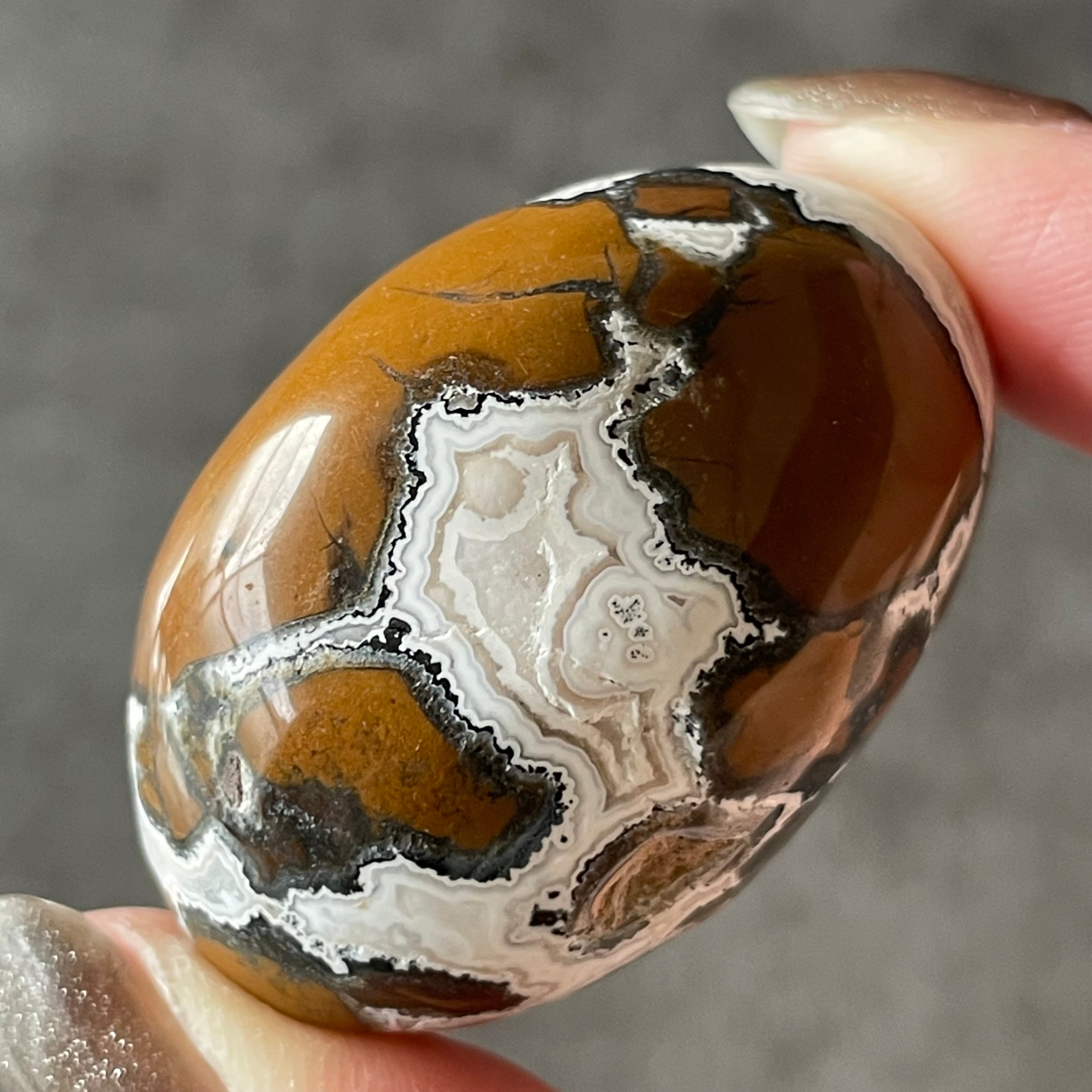 ブラウン、グレーやブルーをベースに、割れ目を埋めるように黒や白の模様が網目状に入った特徴的な石。