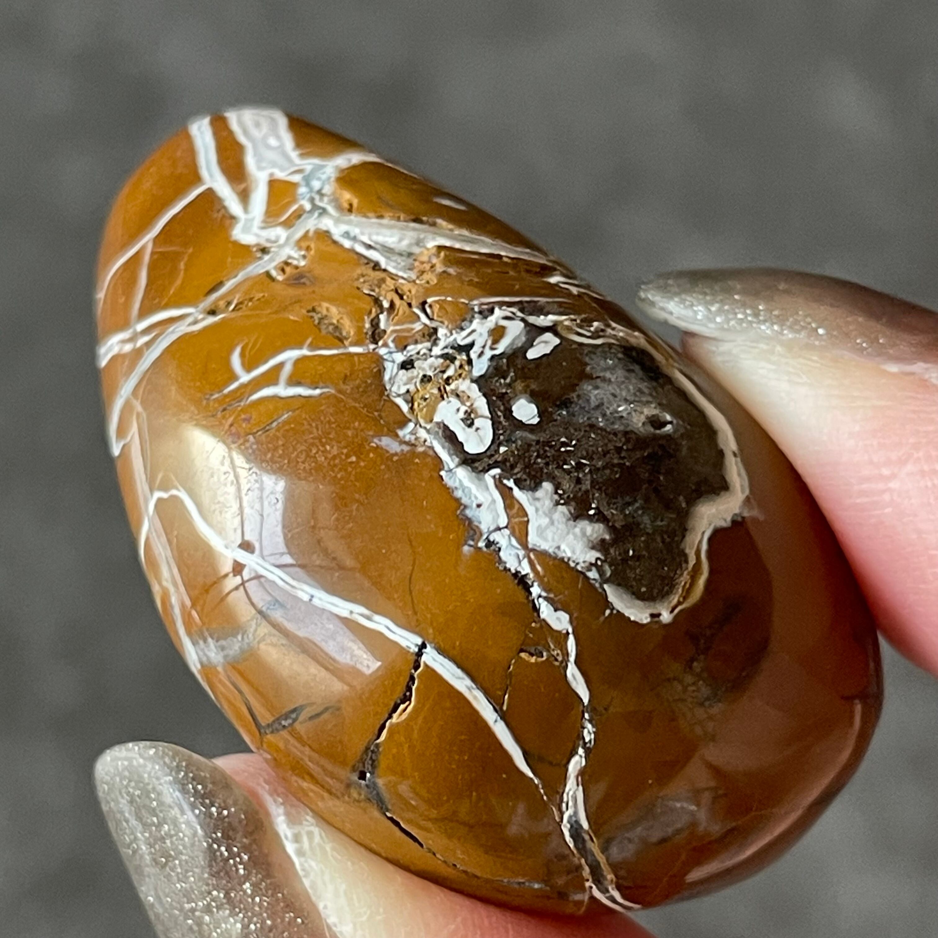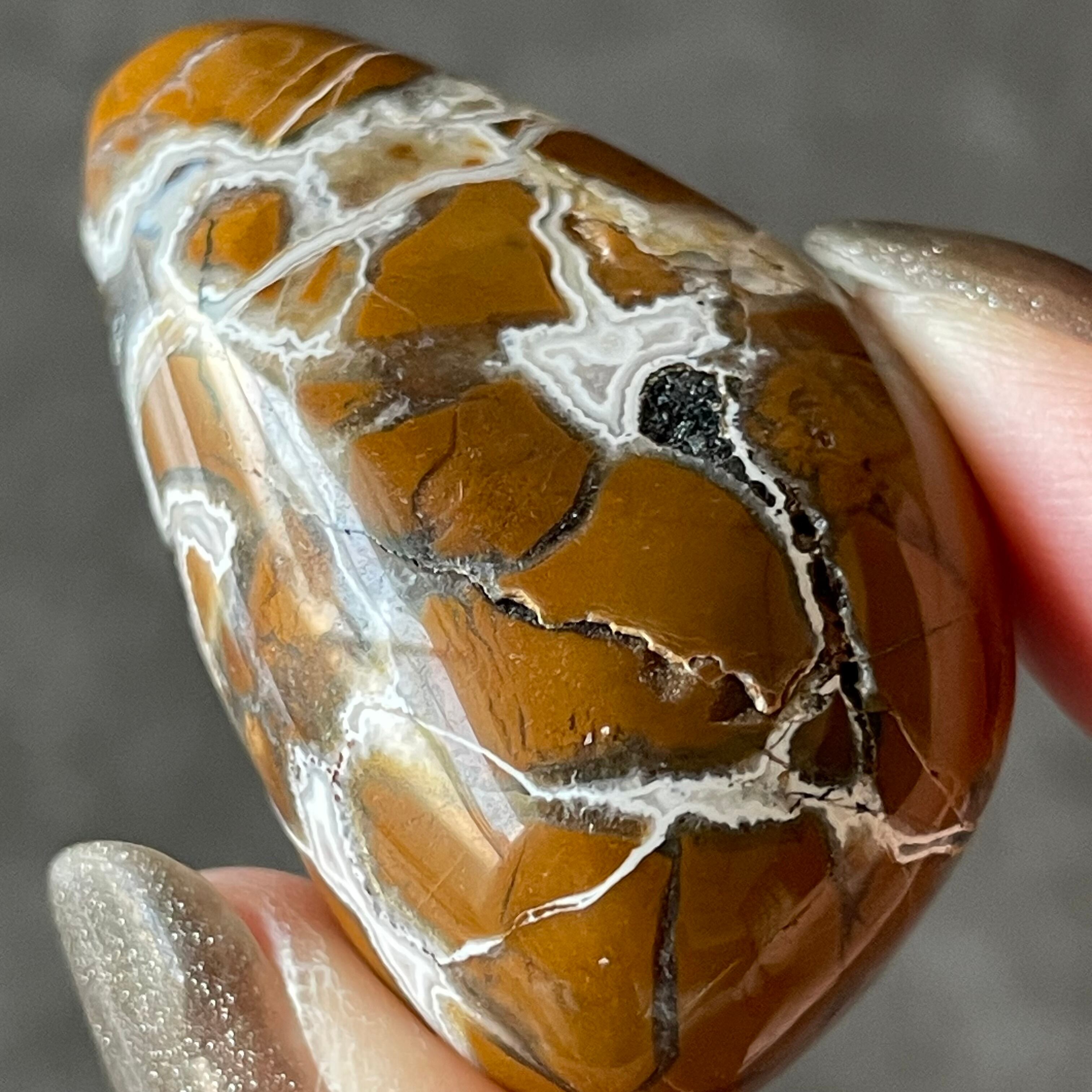 ブラウン、グレーやブルーをベースに、割れ目を埋めるように黒や白の模様が網目状に入った特徴的な石。