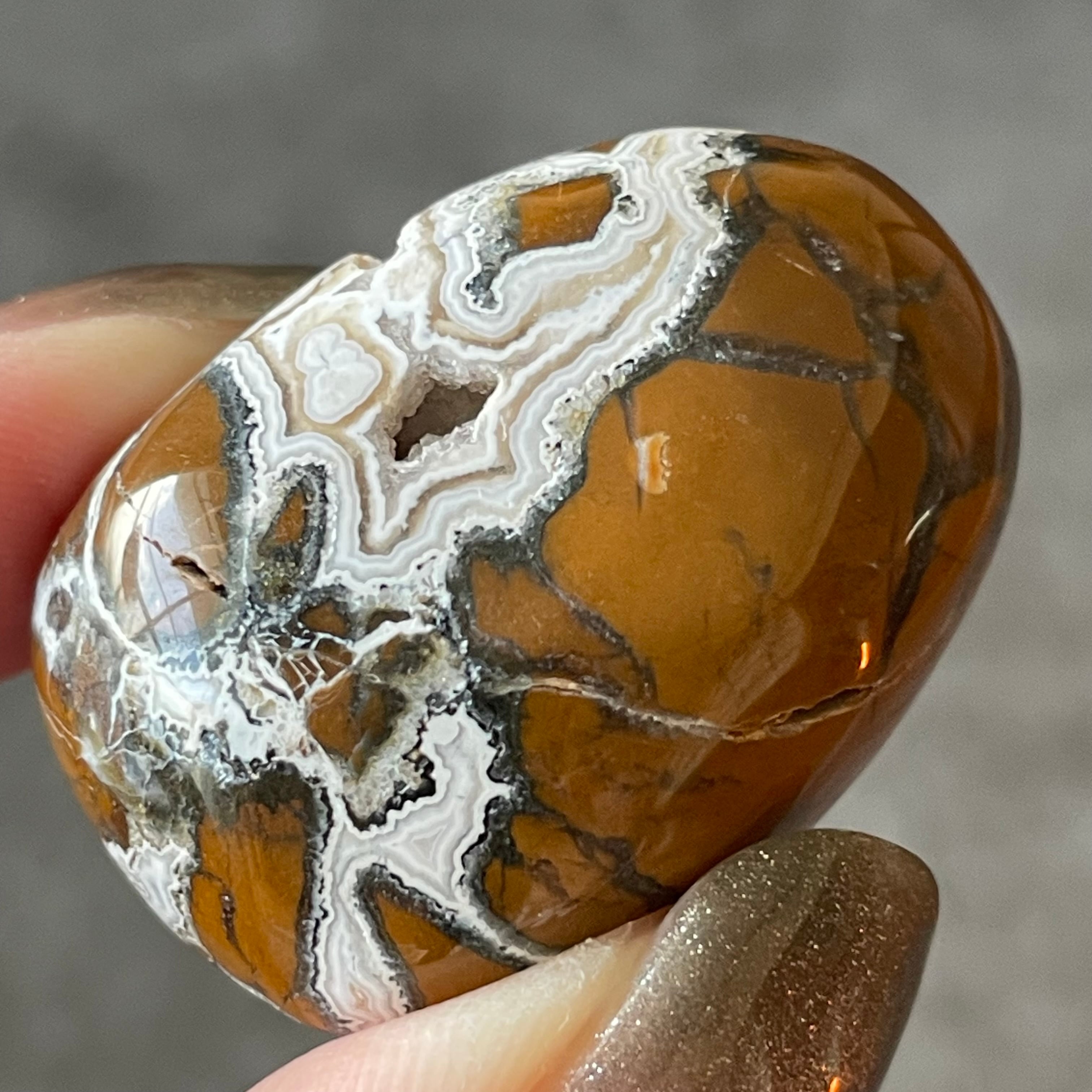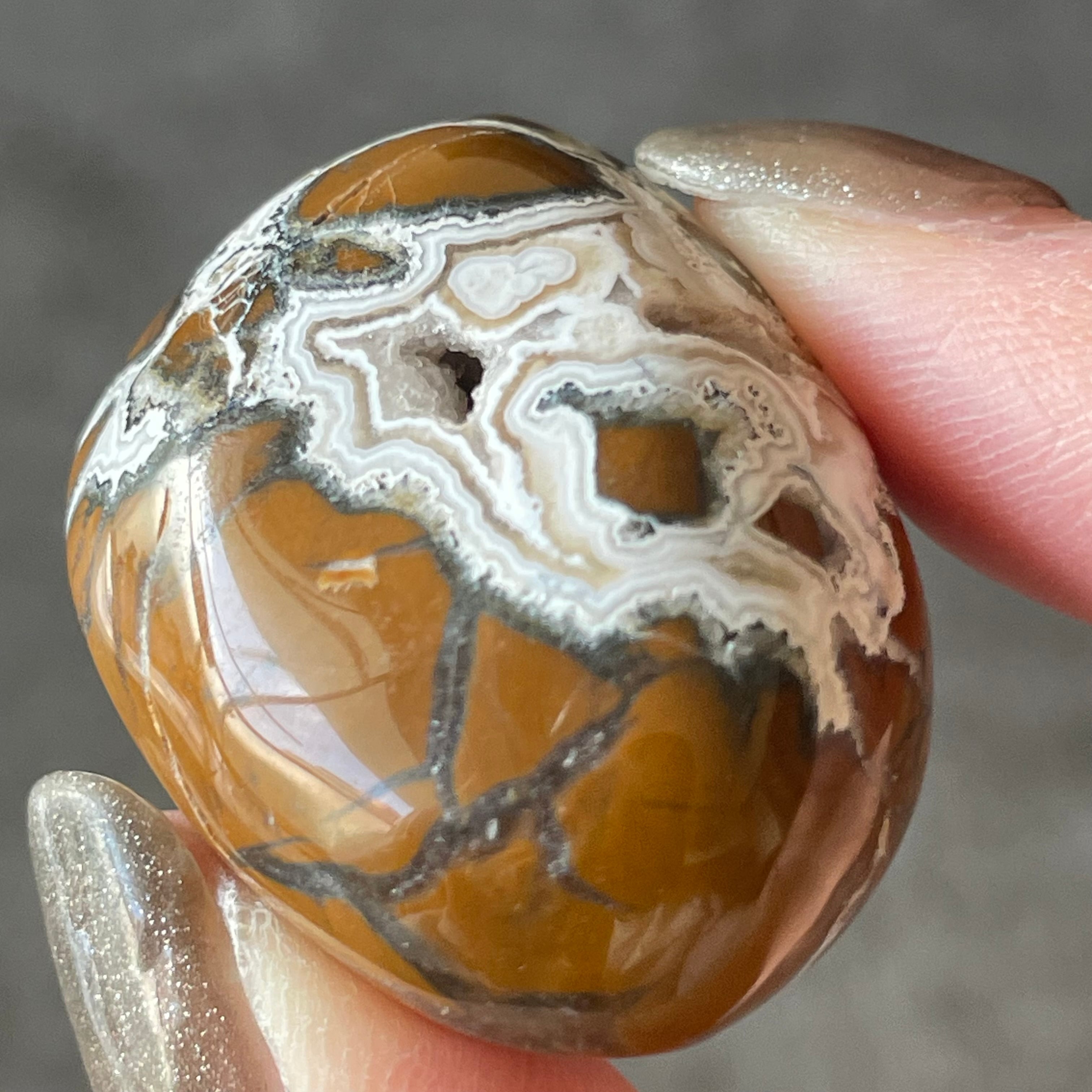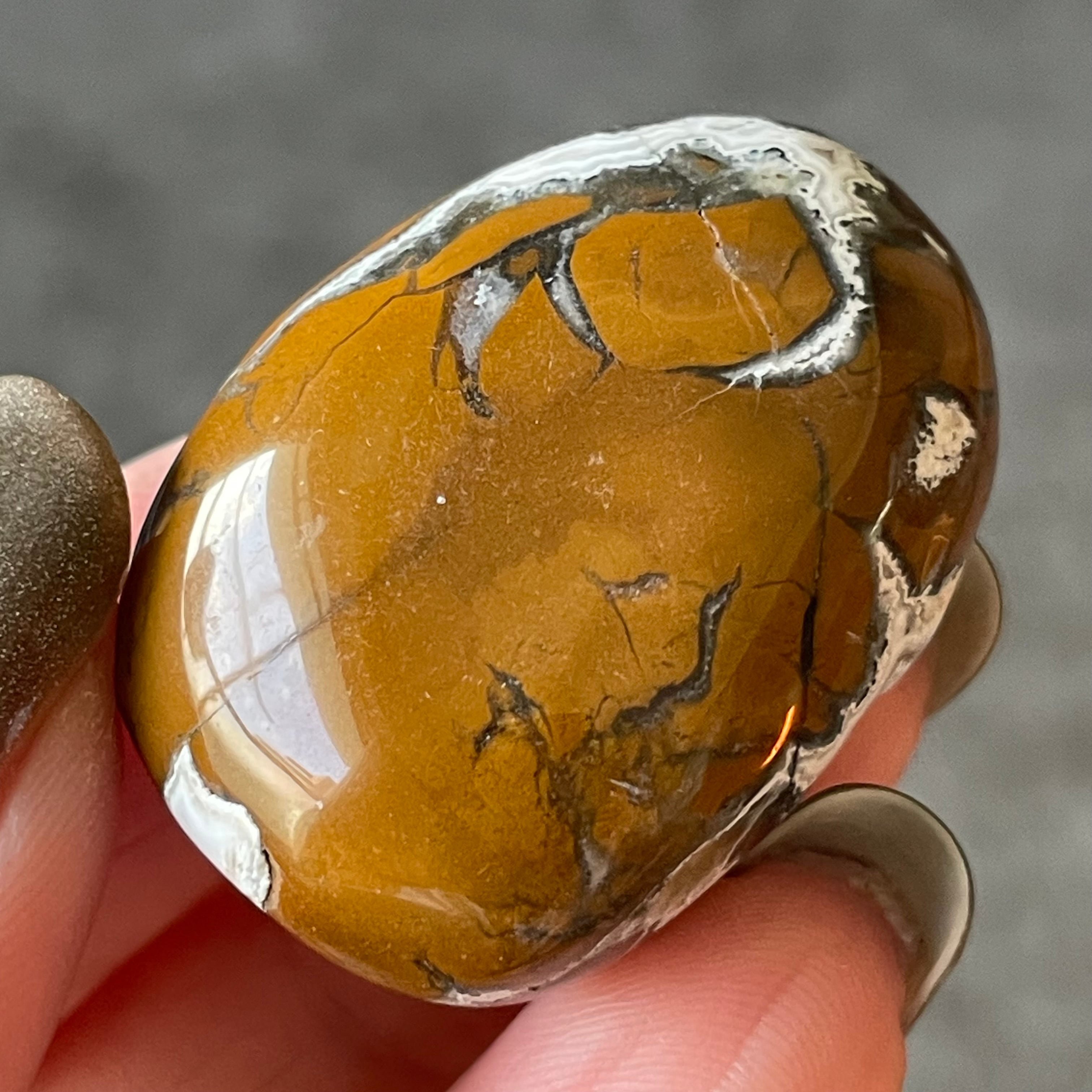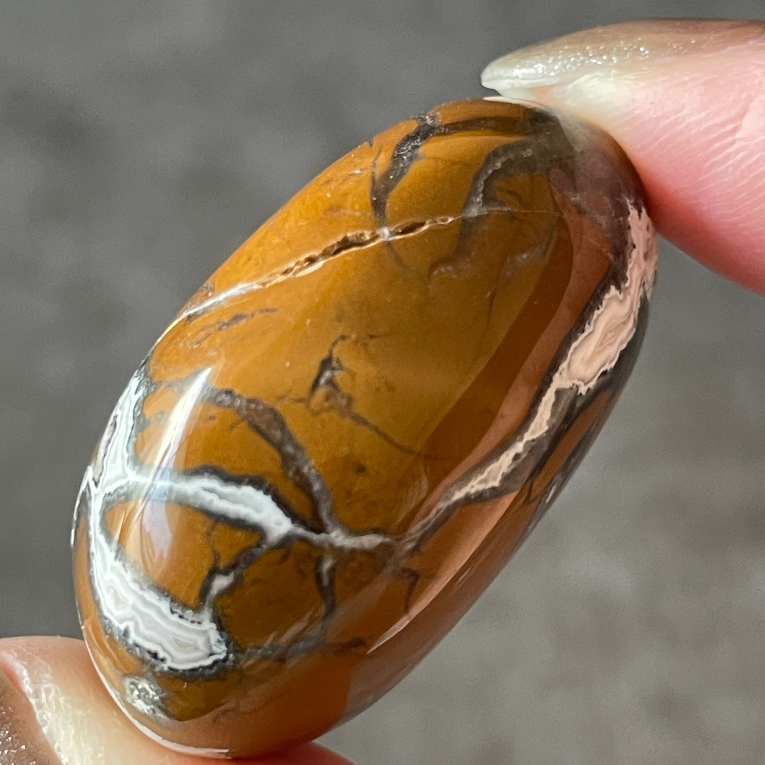 ブラウン、グレーやブルーをベースに、割れ目を埋めるように黒や白の模様が網目状に入った特徴的な石。