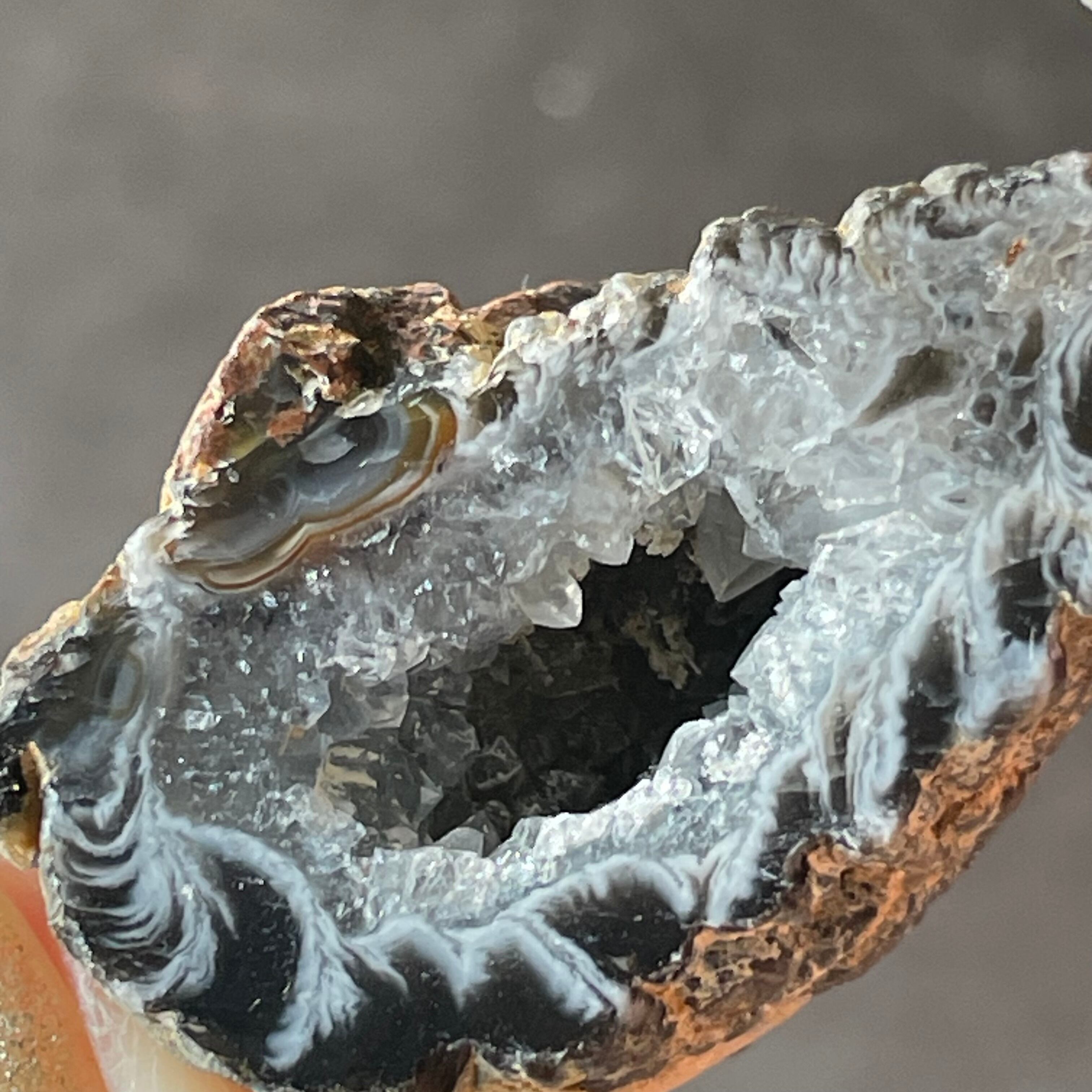 外側の滑らかな縞模様と、中を割ったときに現れるキラキラとした結晶のコントラストが魅力。