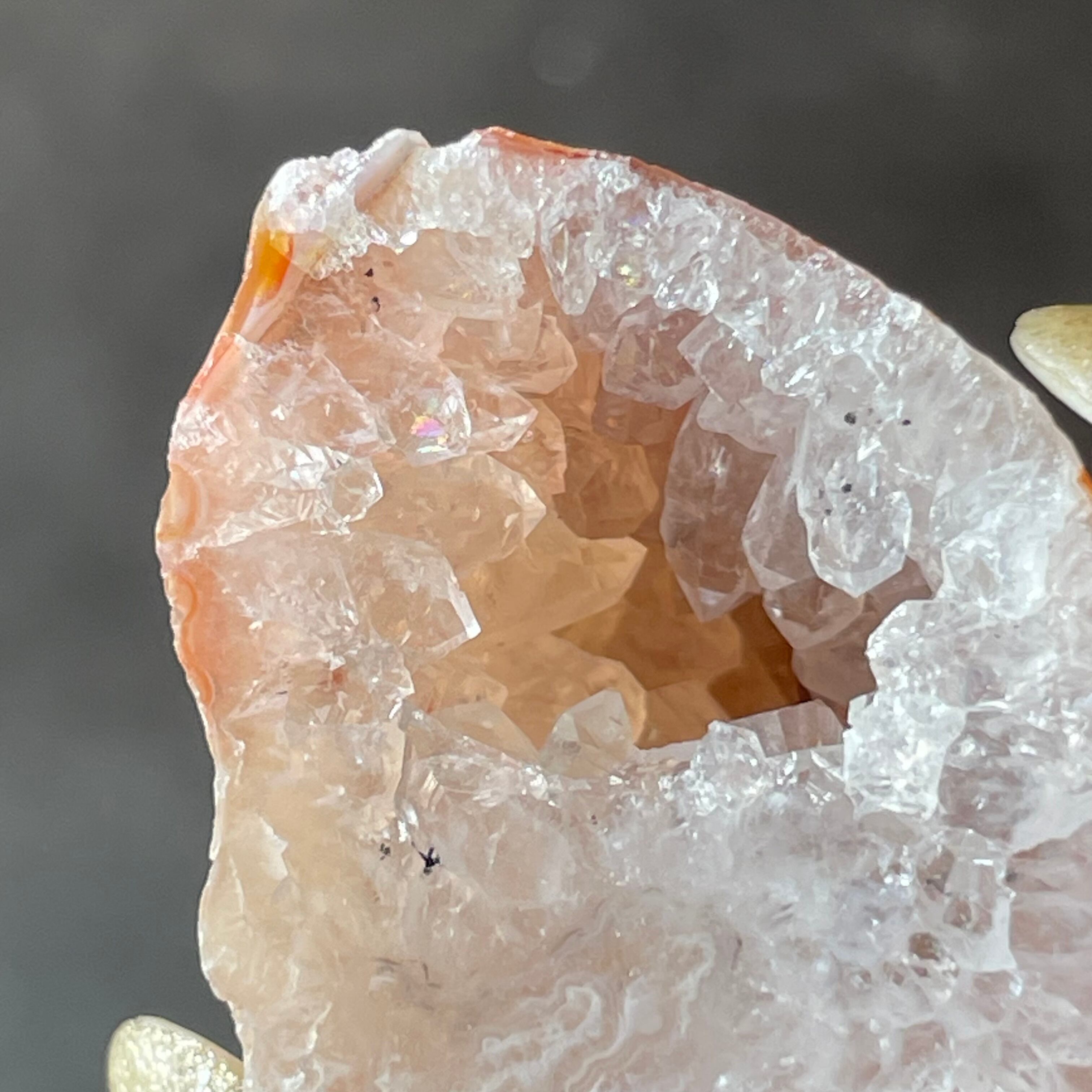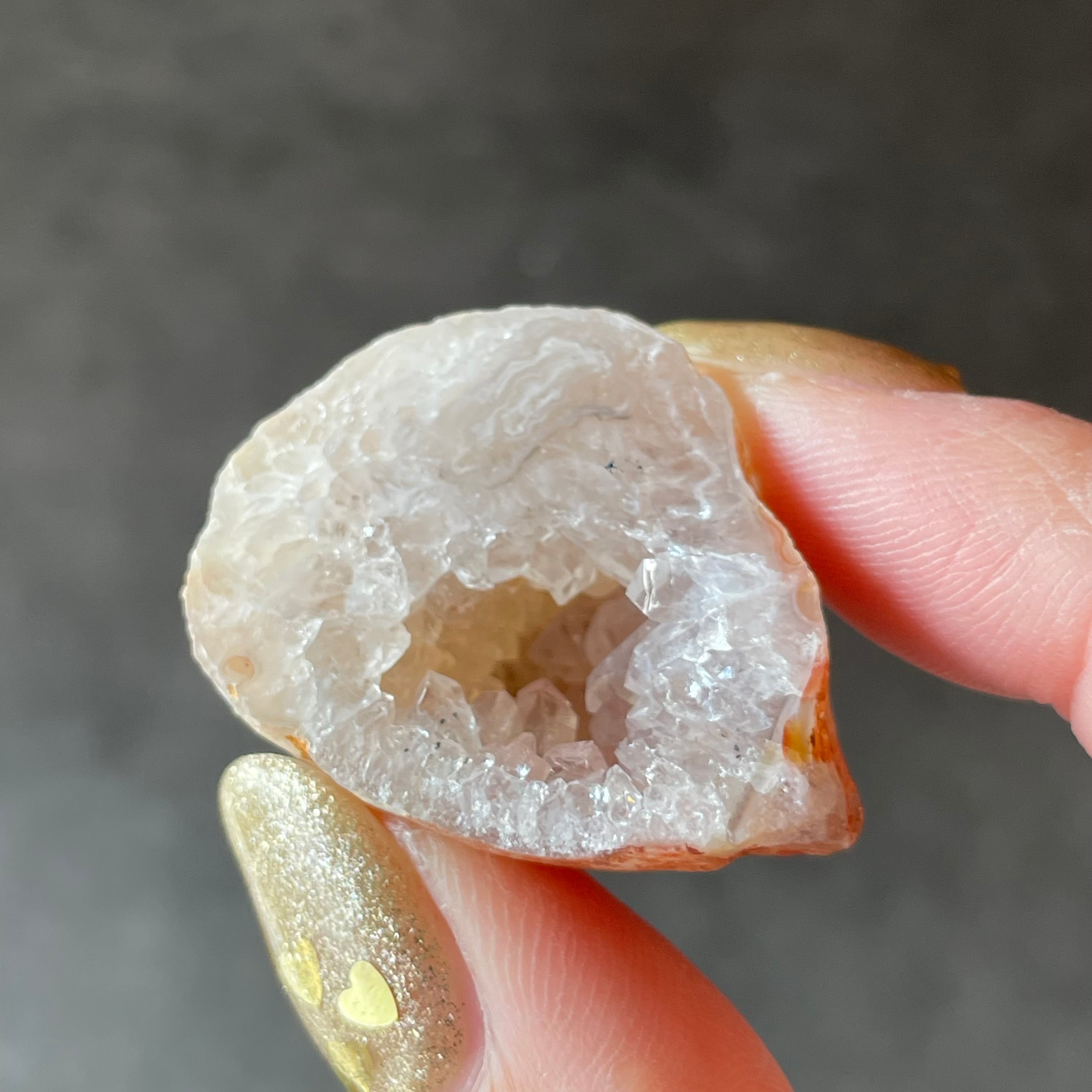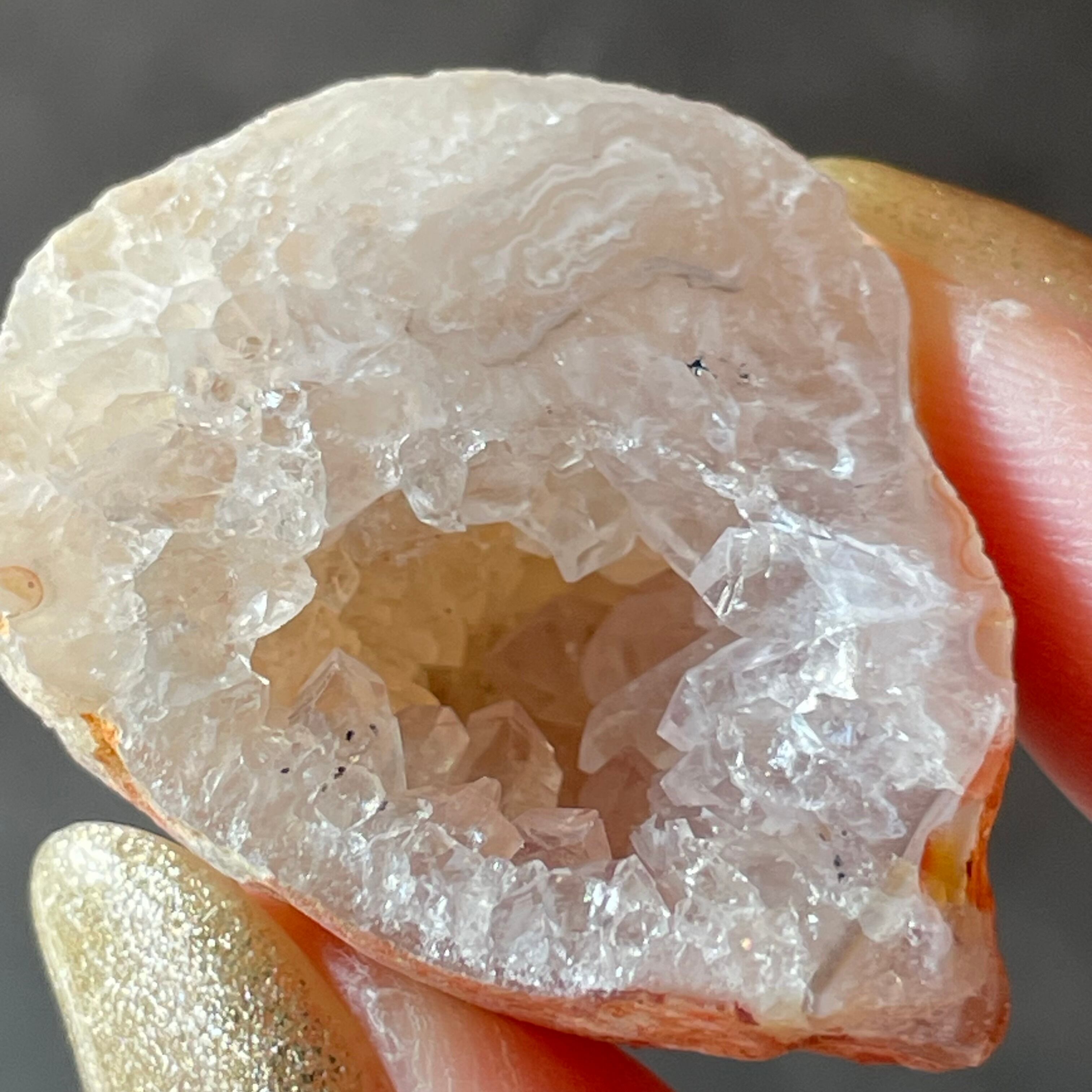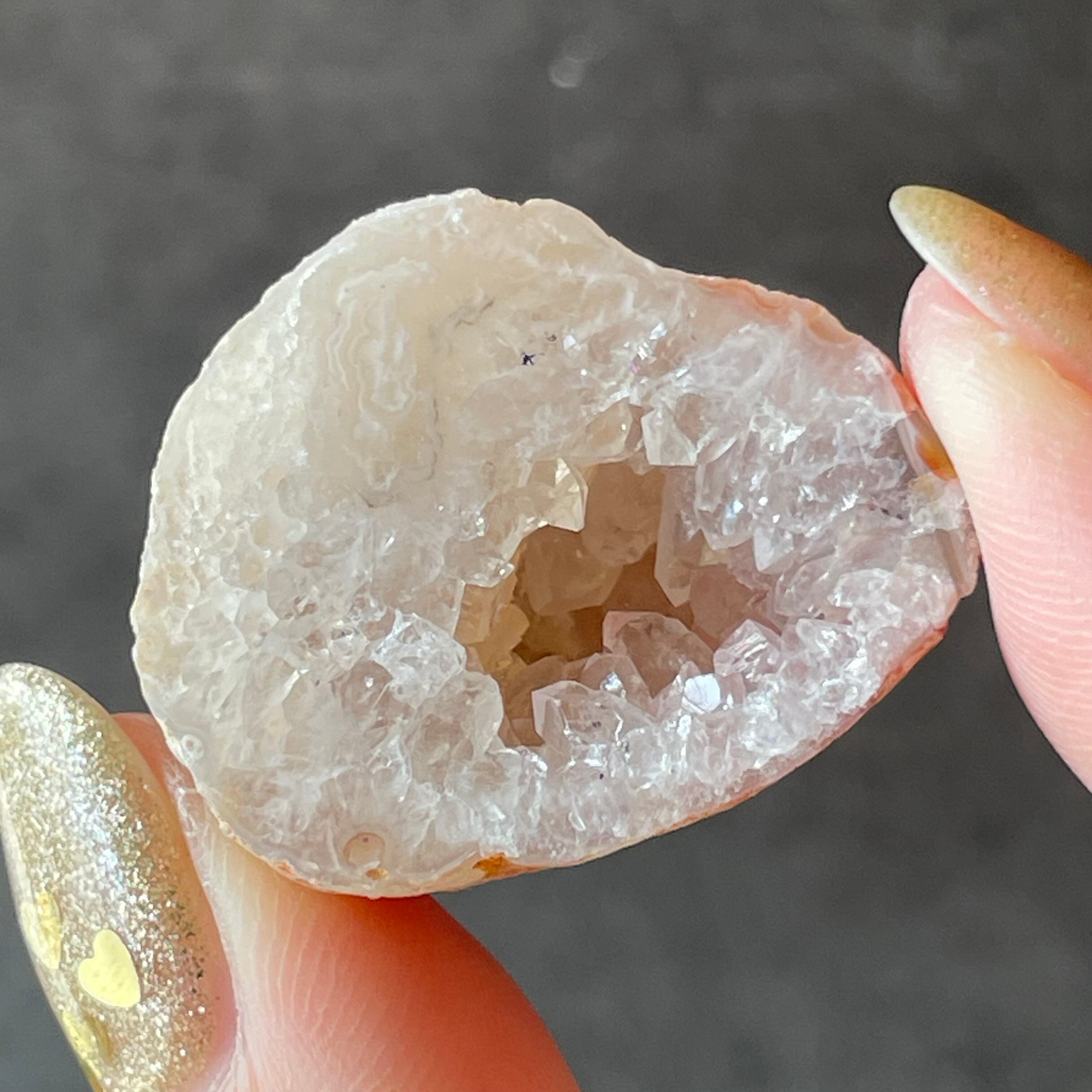 外側の滑らかな縞模様と、中を割ったときに現れるキラキラとした結晶のコントラストが魅力。