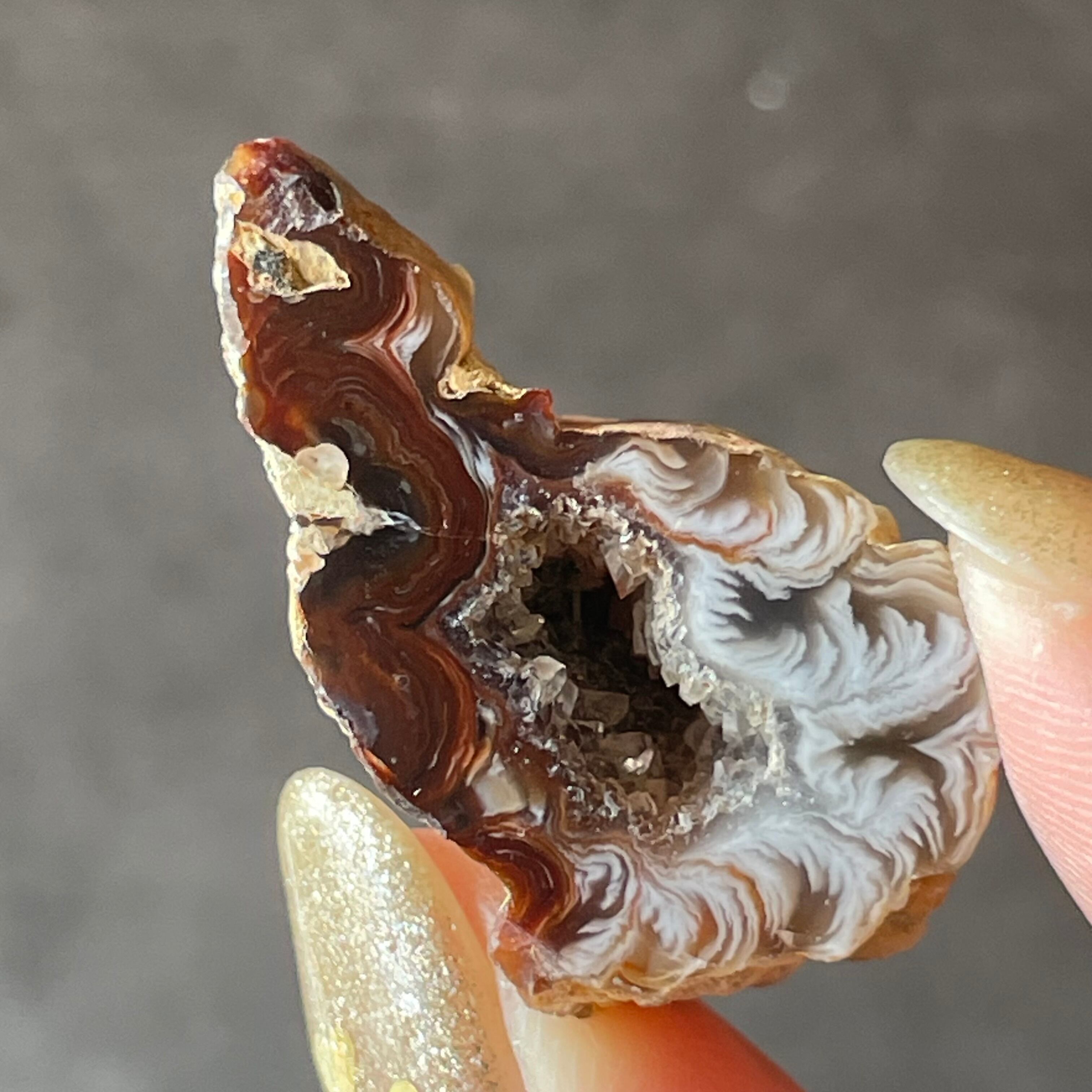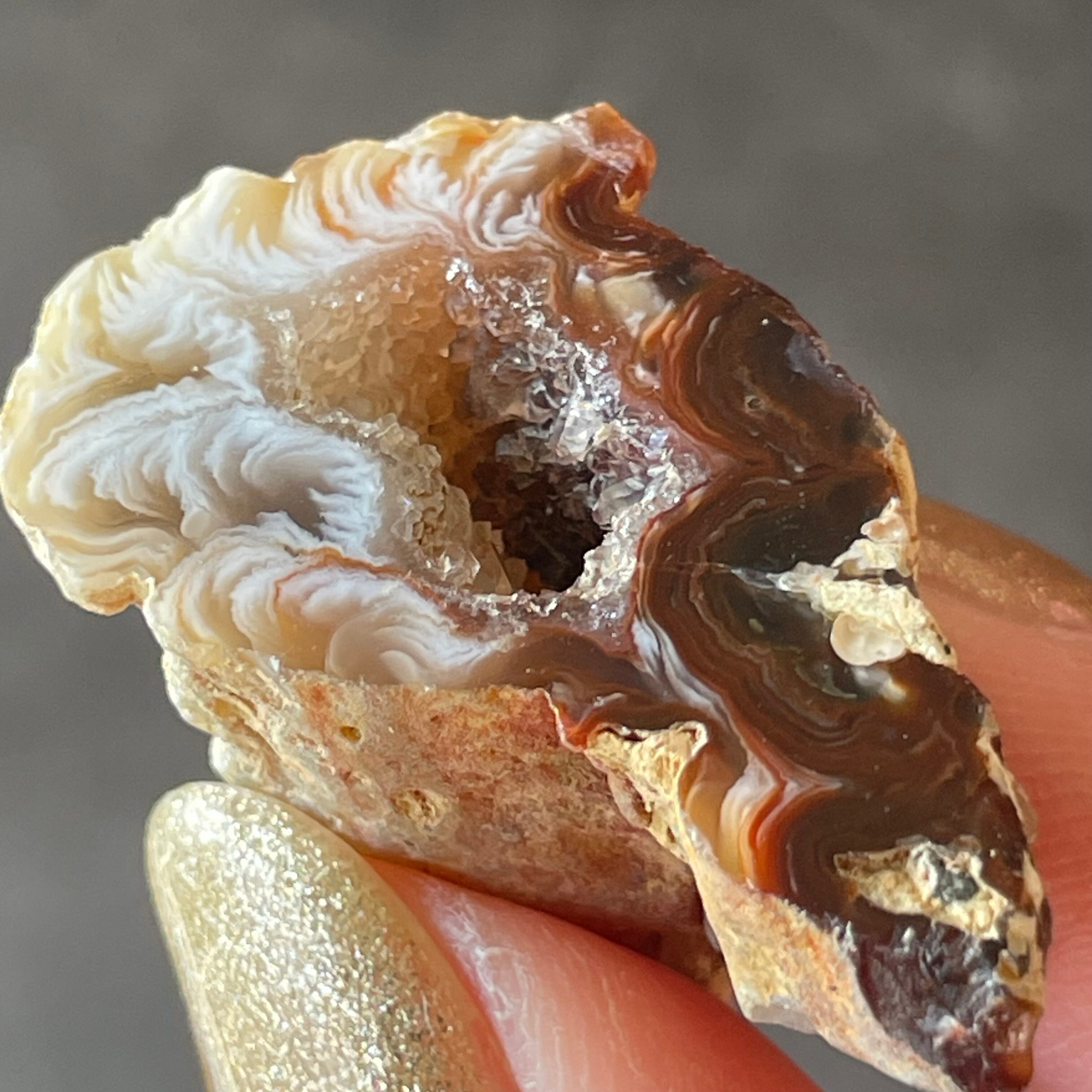 外側の滑らかな縞模様と、中を割ったときに現れるキラキラとした結晶のコントラストが魅力。