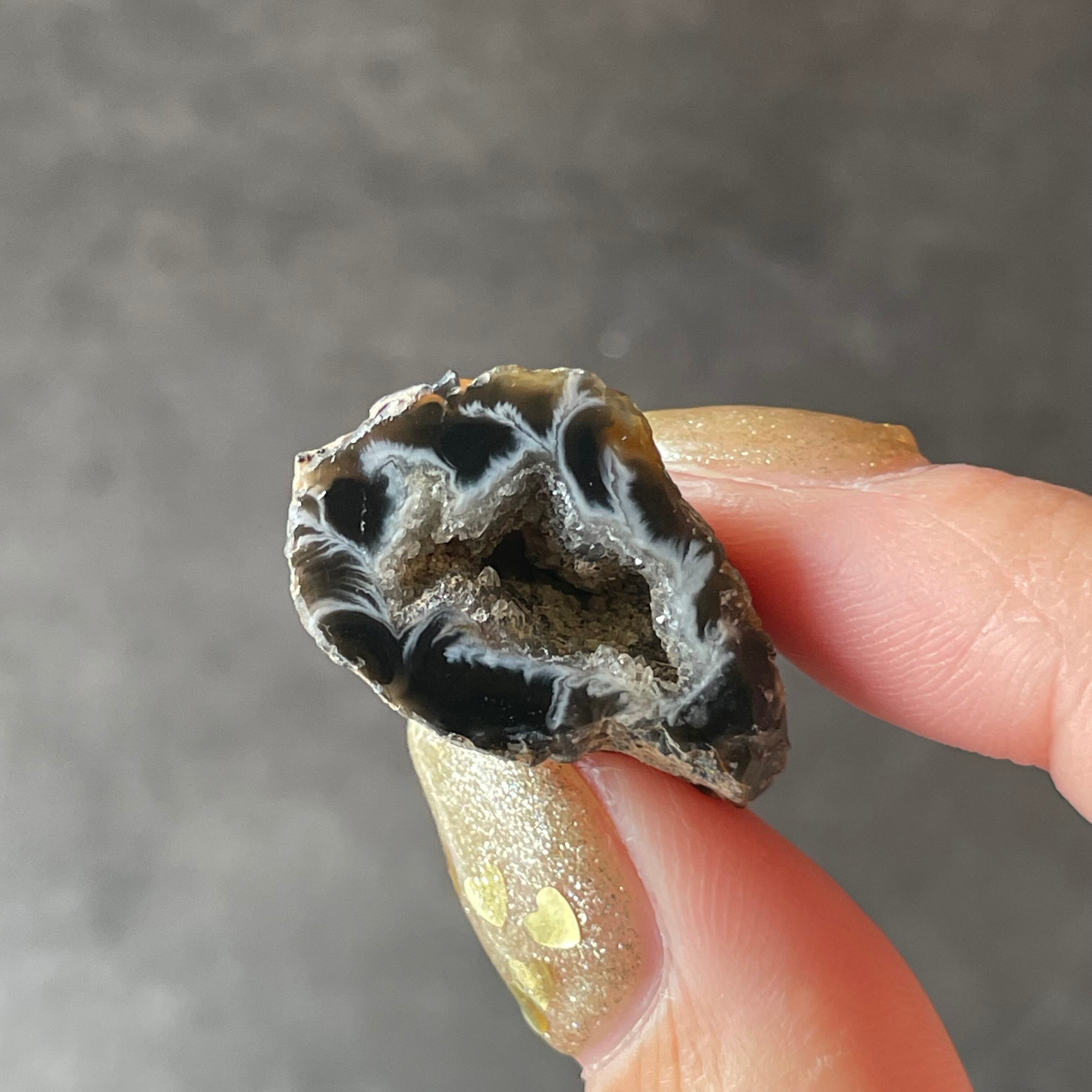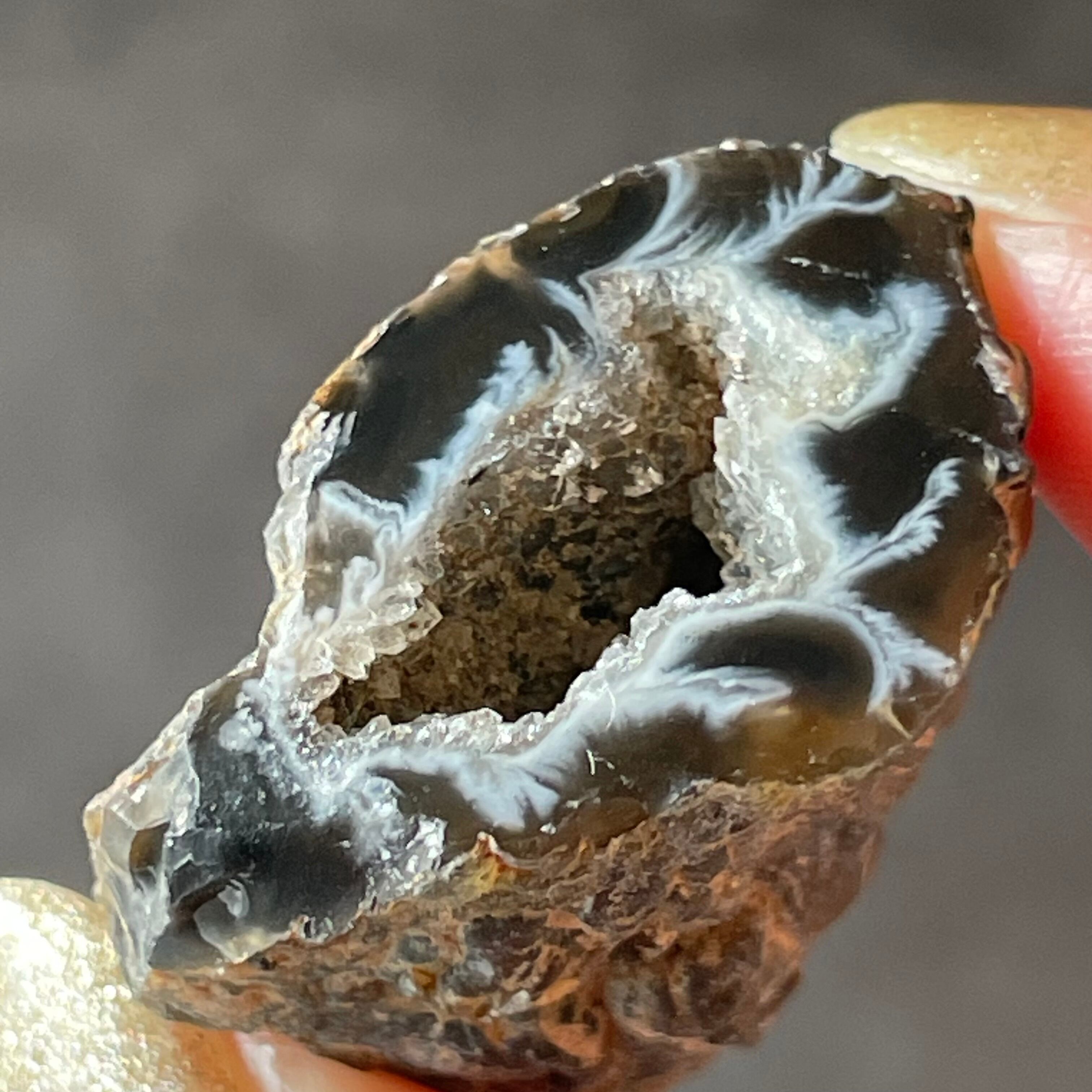 外側の滑らかな縞模様と、中を割ったときに現れるキラキラとした結晶のコントラストが魅力。