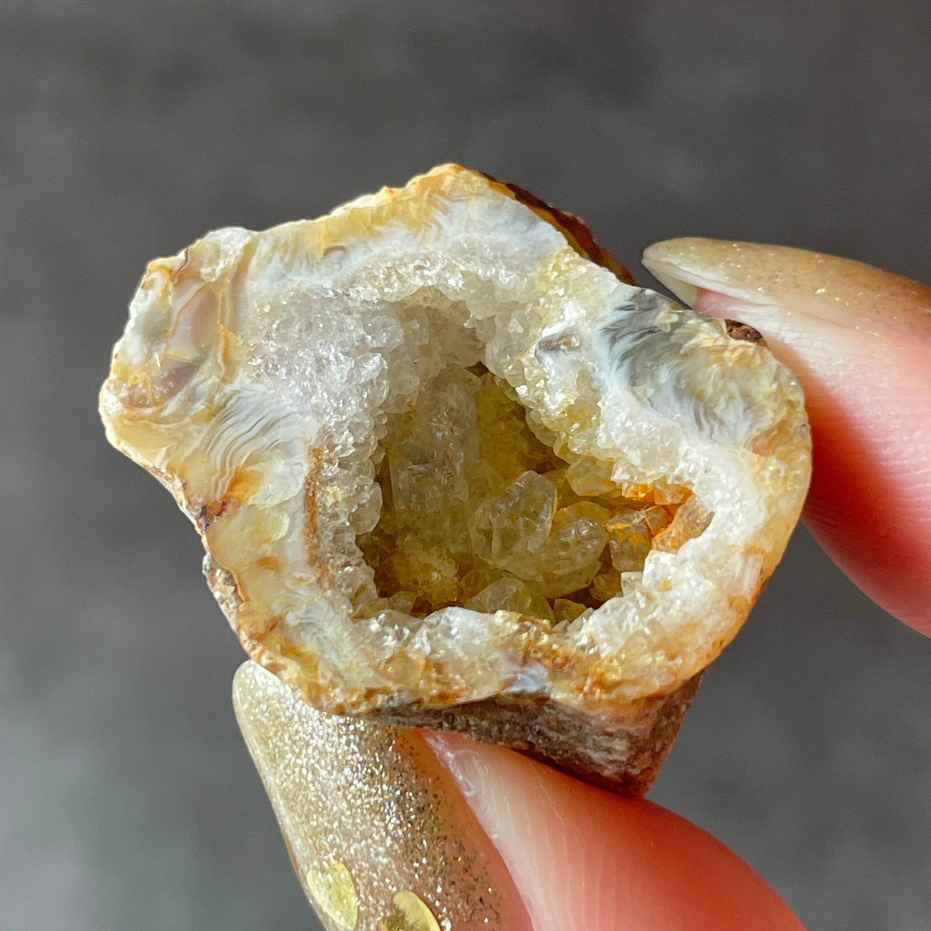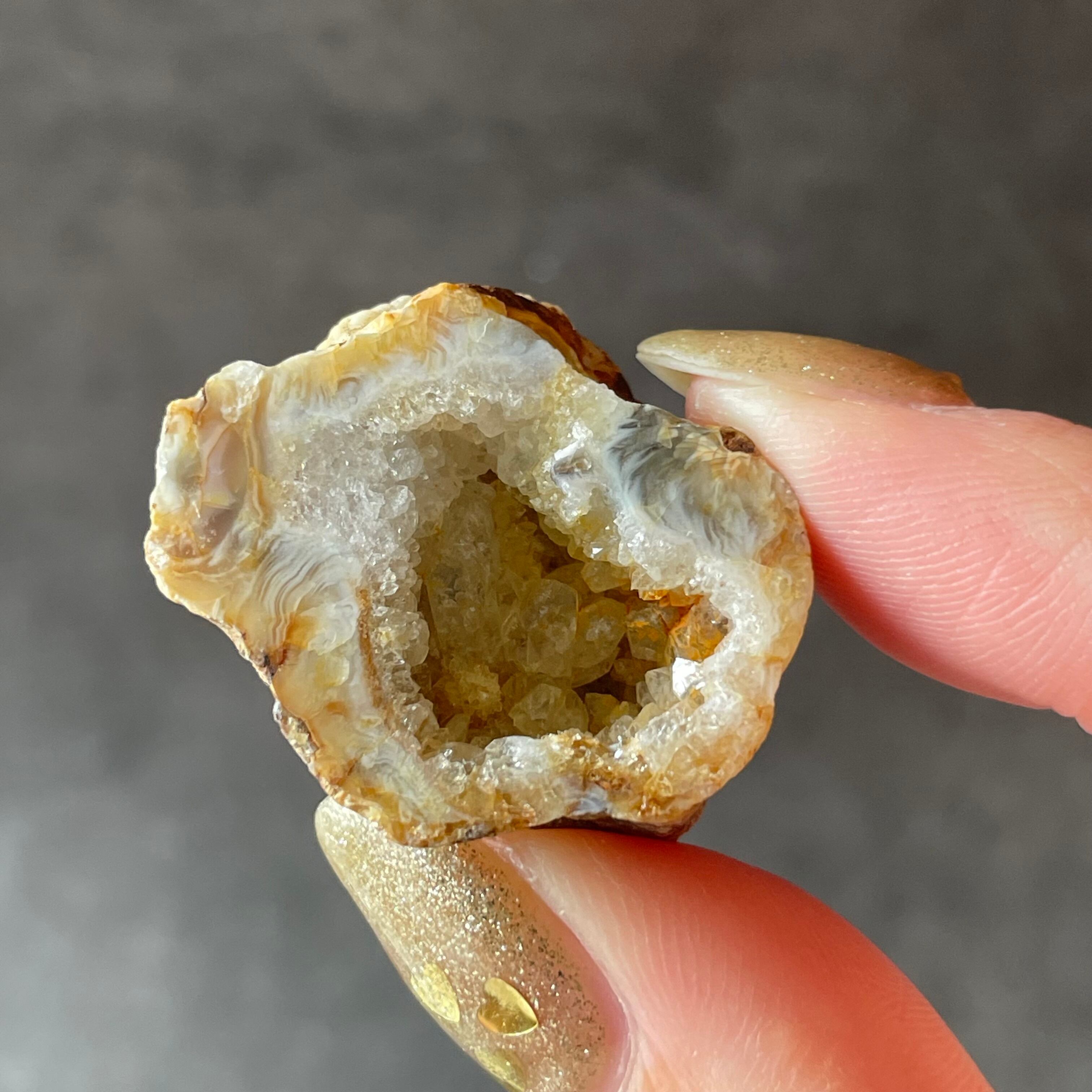 外側の滑らかな縞模様と、中を割ったときに現れるキラキラとした結晶のコントラストが魅力。