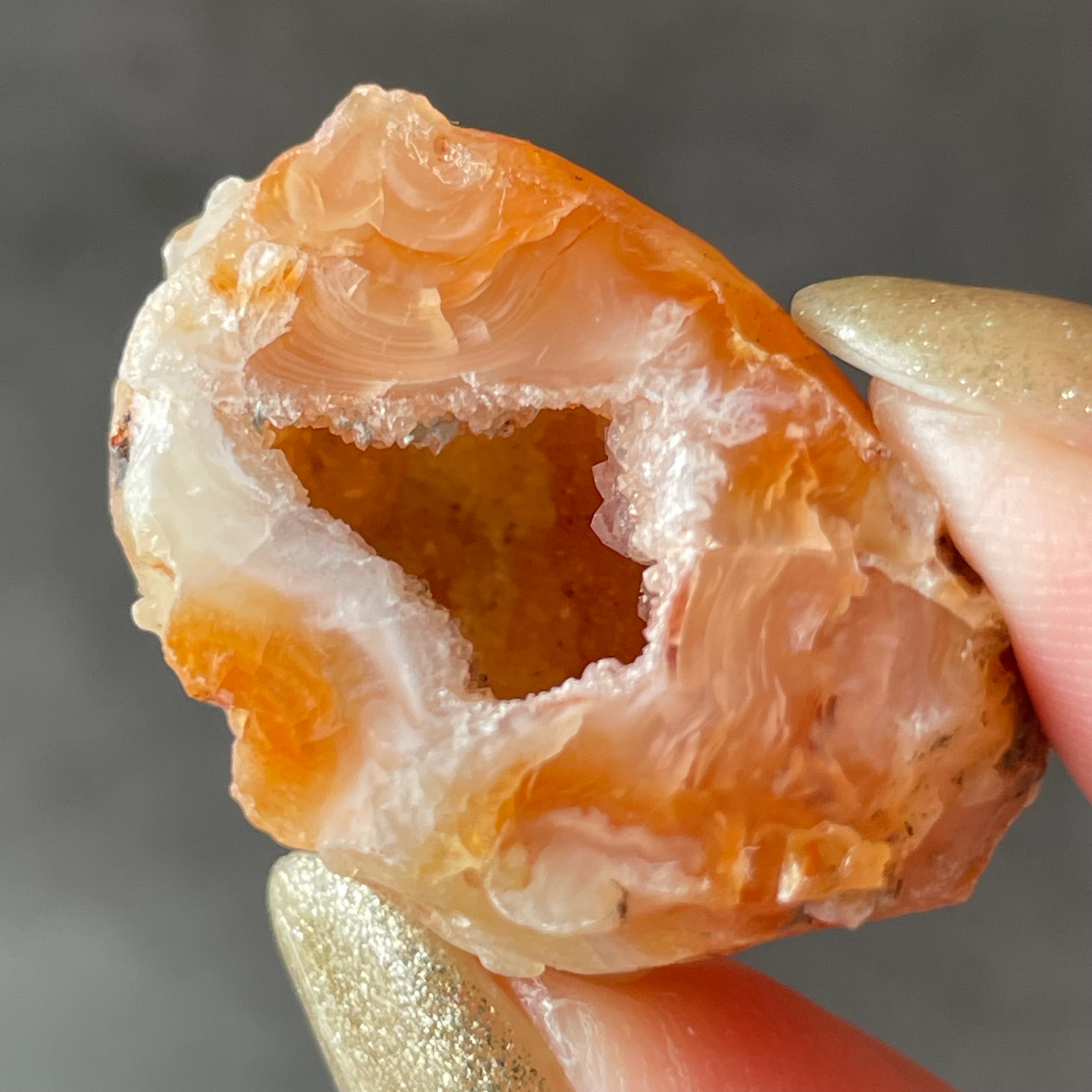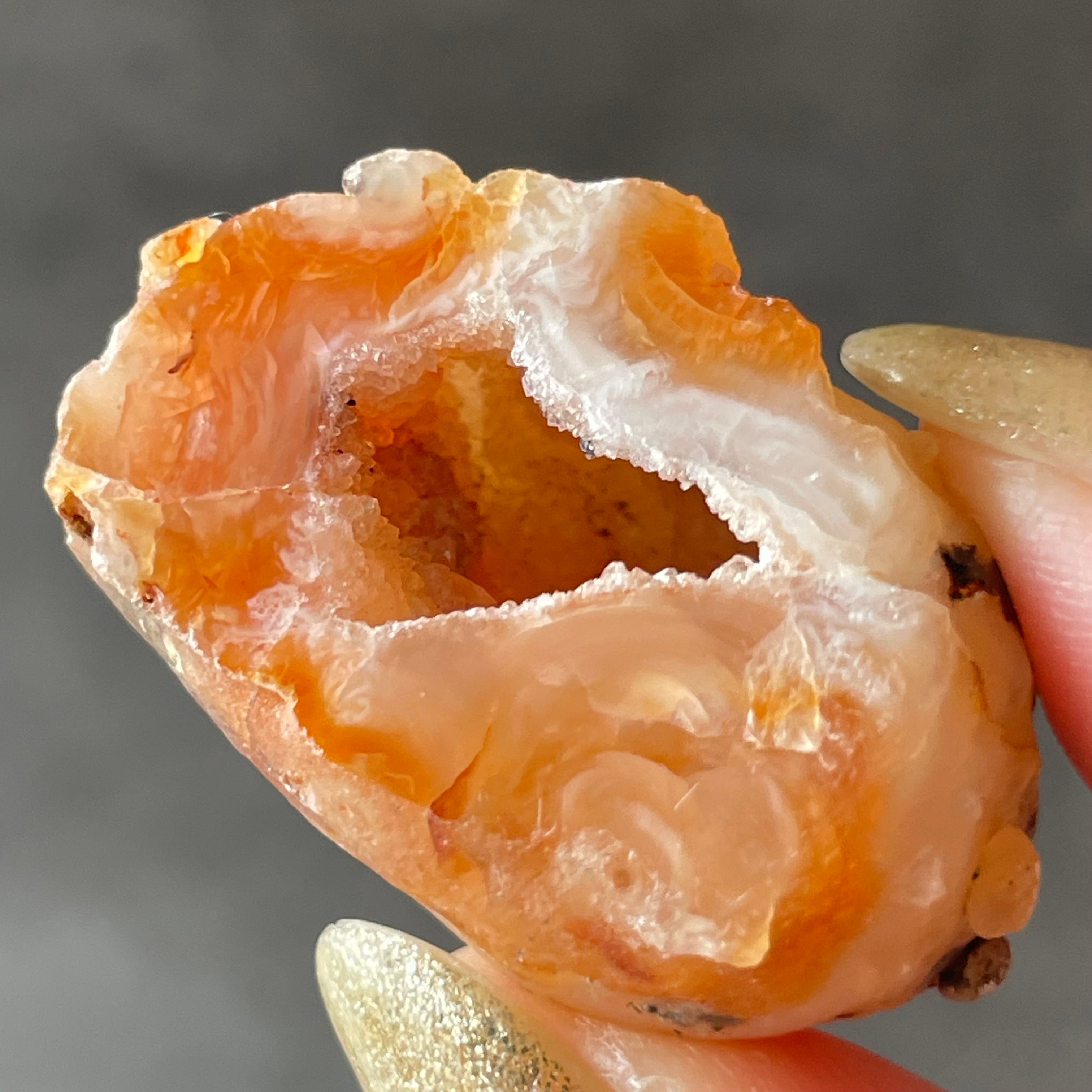 外側の滑らかな縞模様と、中を割ったときに現れるキラキラとした結晶のコントラストが魅力。