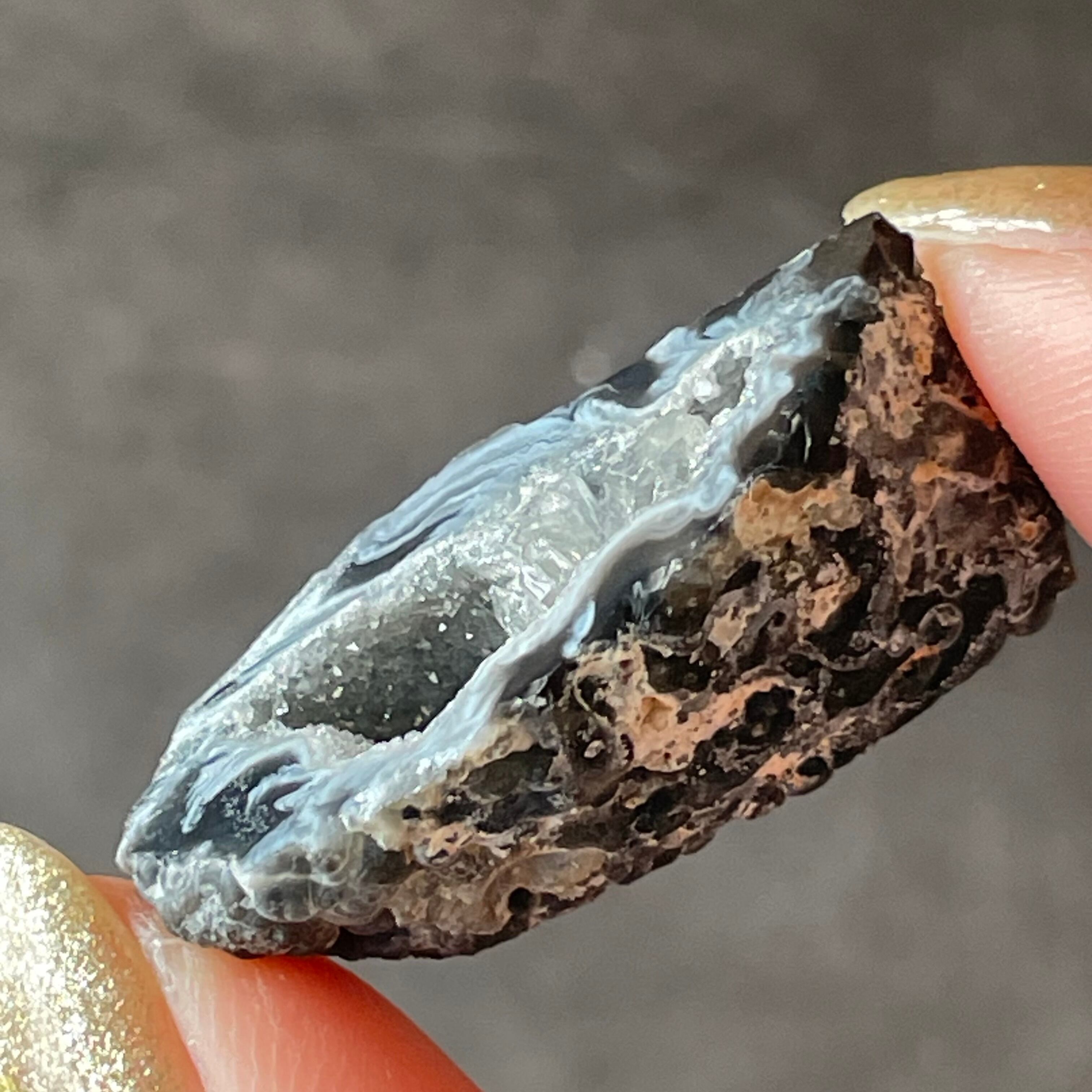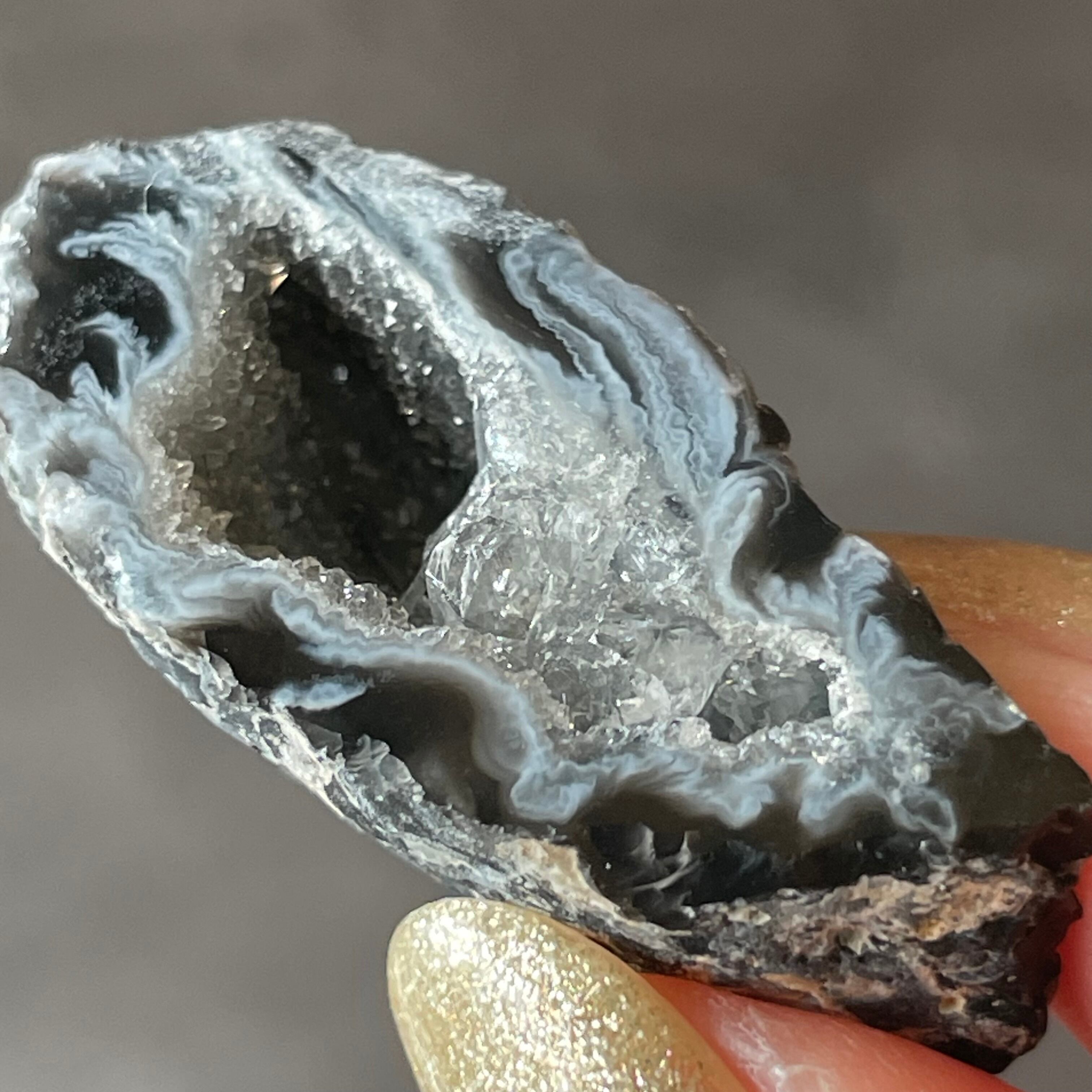 外側の滑らかな縞模様と、中を割ったときに現れるキラキラとした結晶のコントラストが魅力。