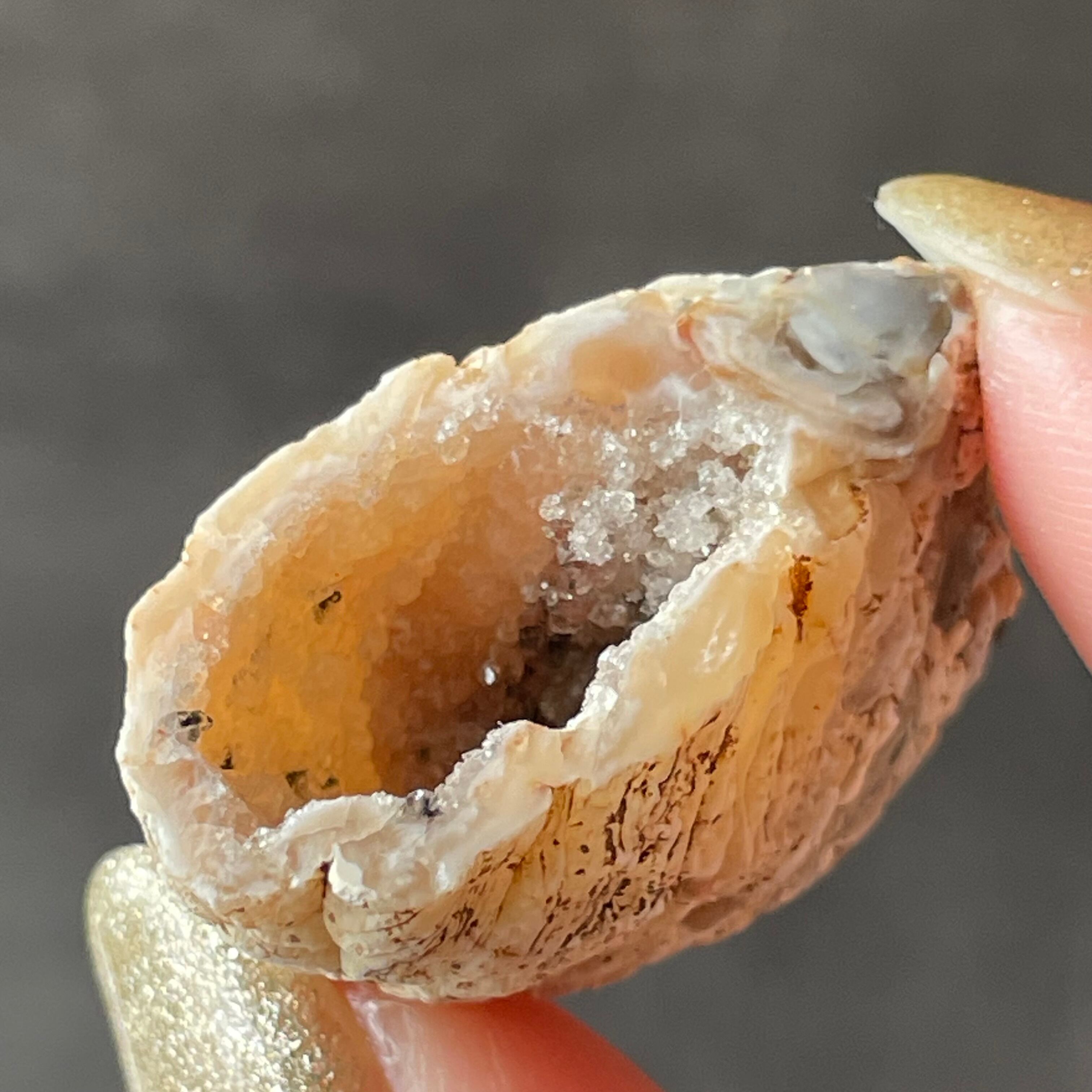 外側の滑らかな縞模様と、中を割ったときに現れるキラキラとした結晶のコントラストが魅力。