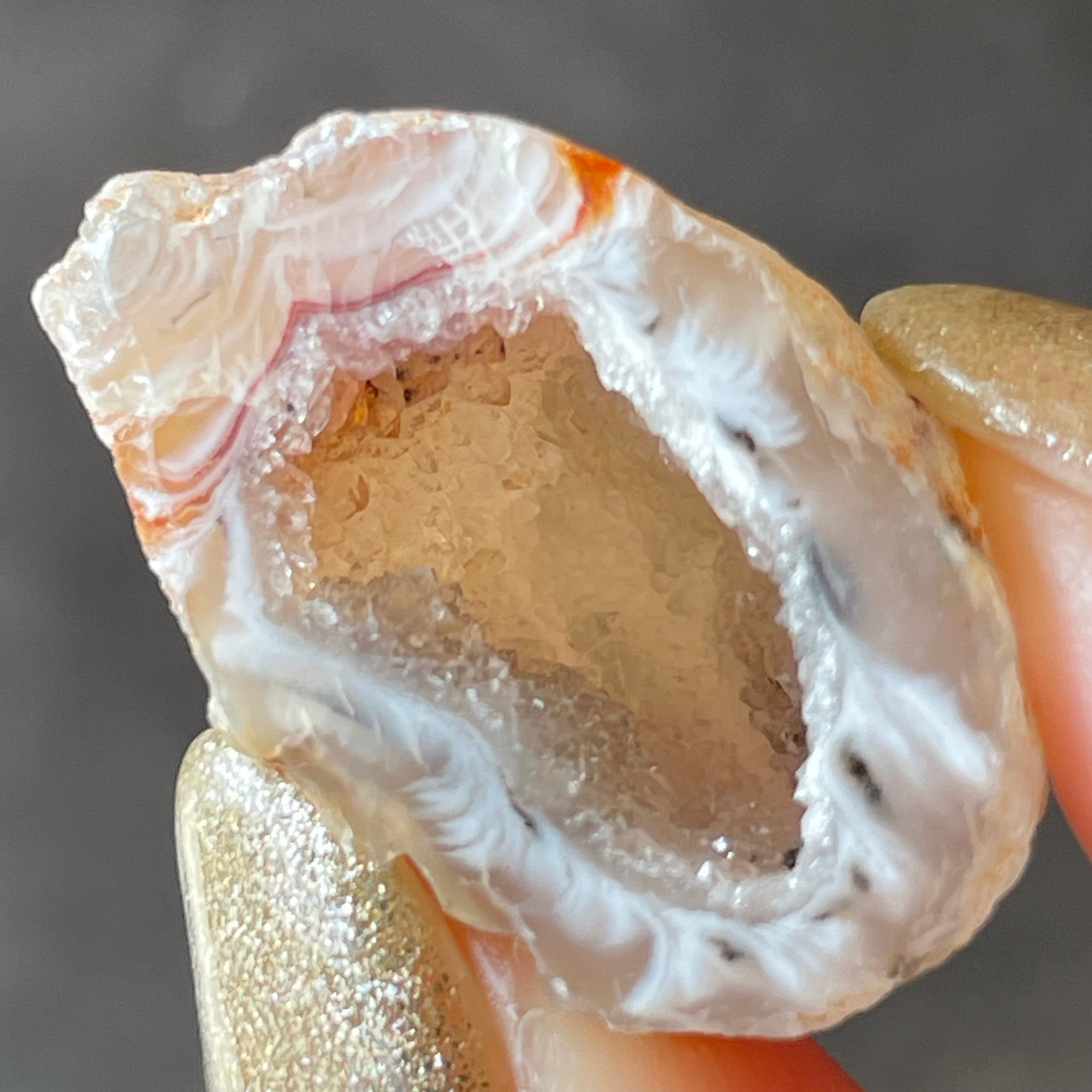 外側の滑らかな縞模様と、中を割ったときに現れるキラキラとした結晶のコントラストが魅力。