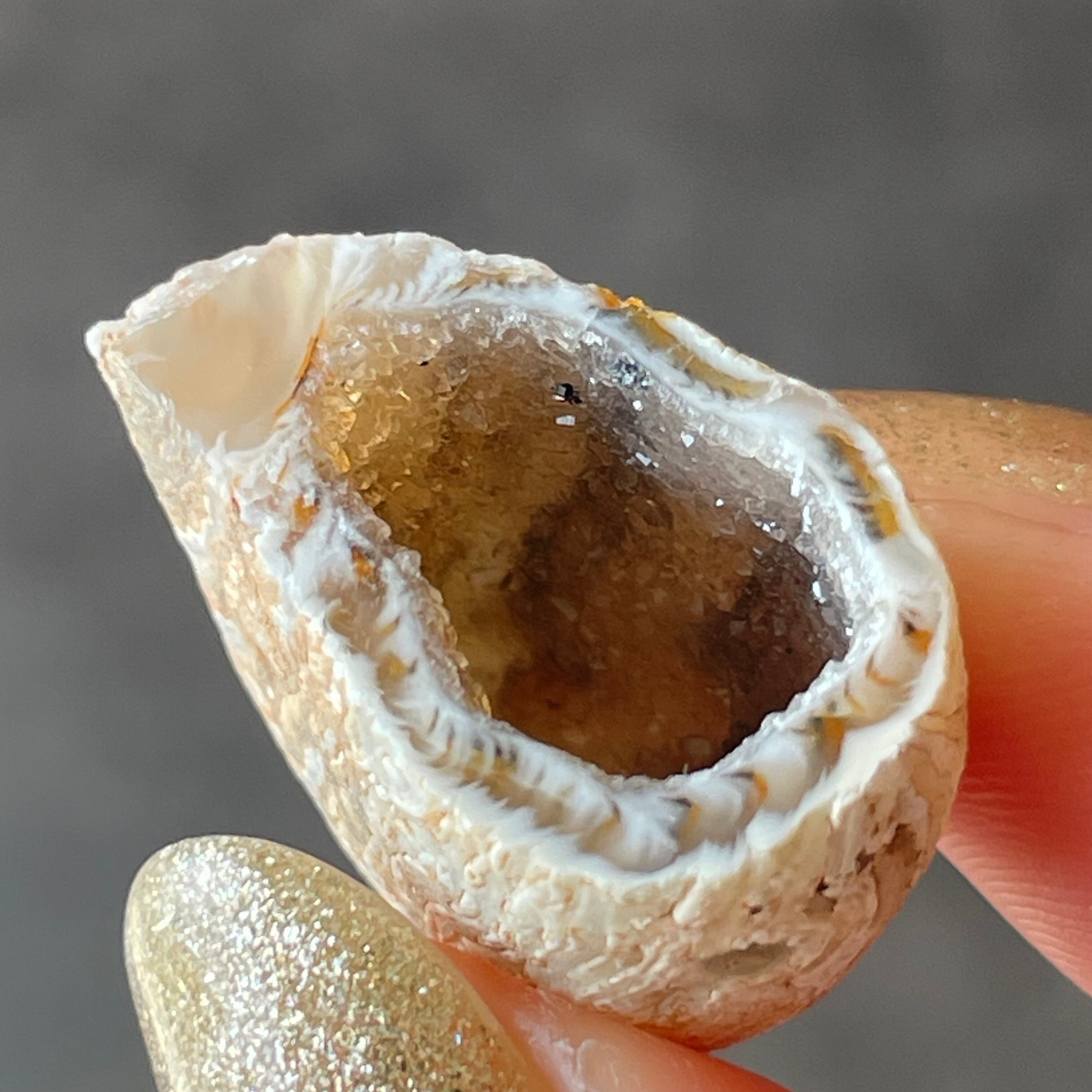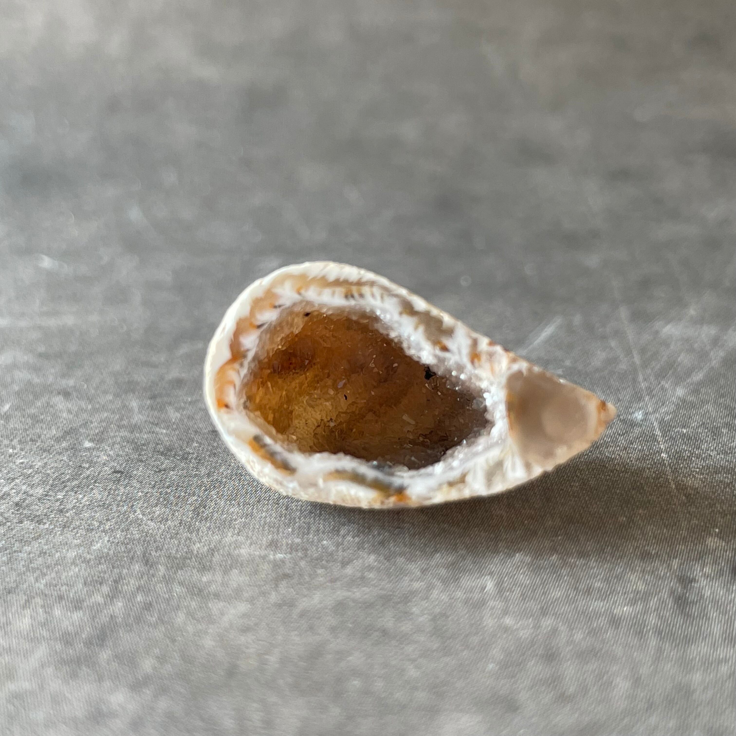 外側の滑らかな縞模様と、中を割ったときに現れるキラキラとした結晶のコントラストが魅力。