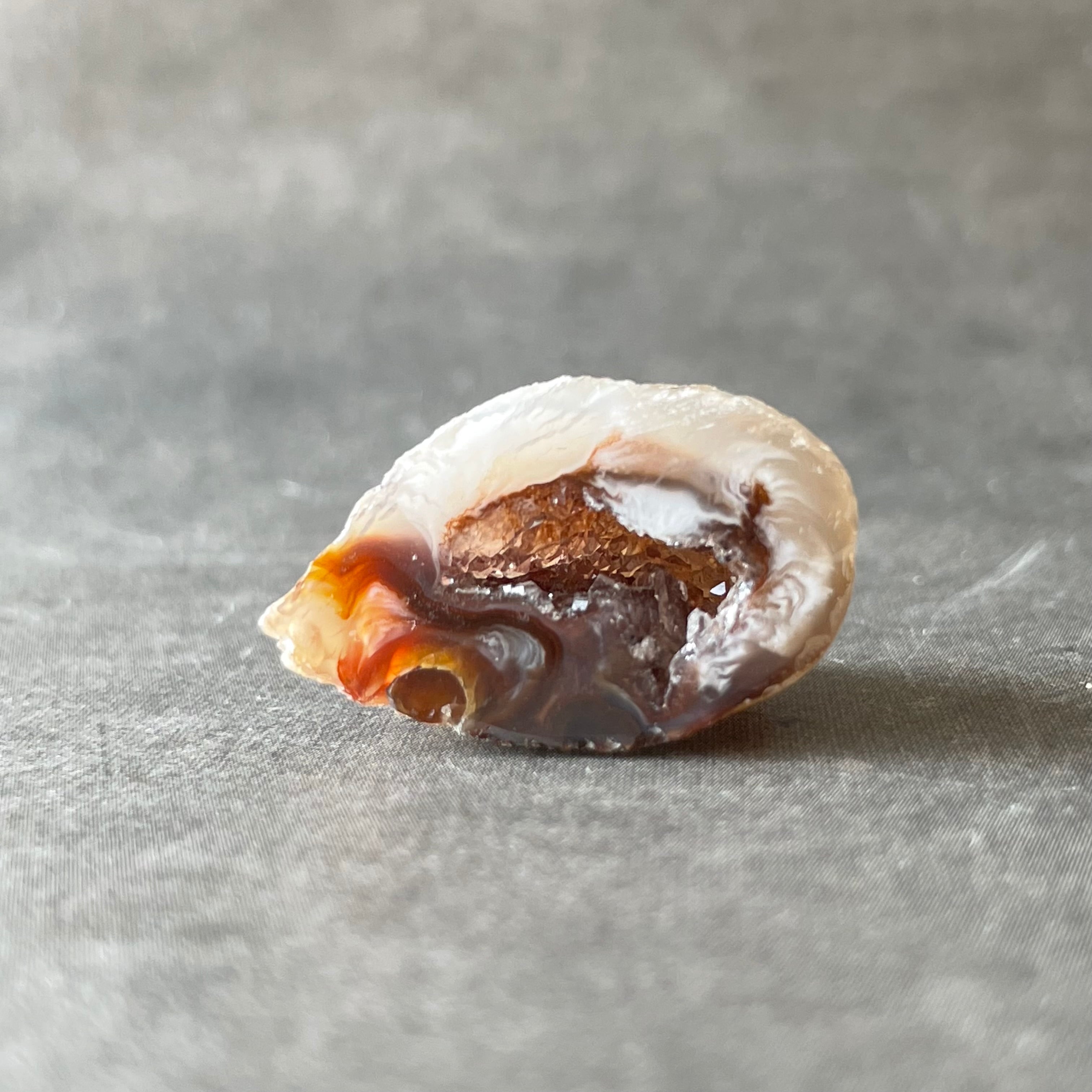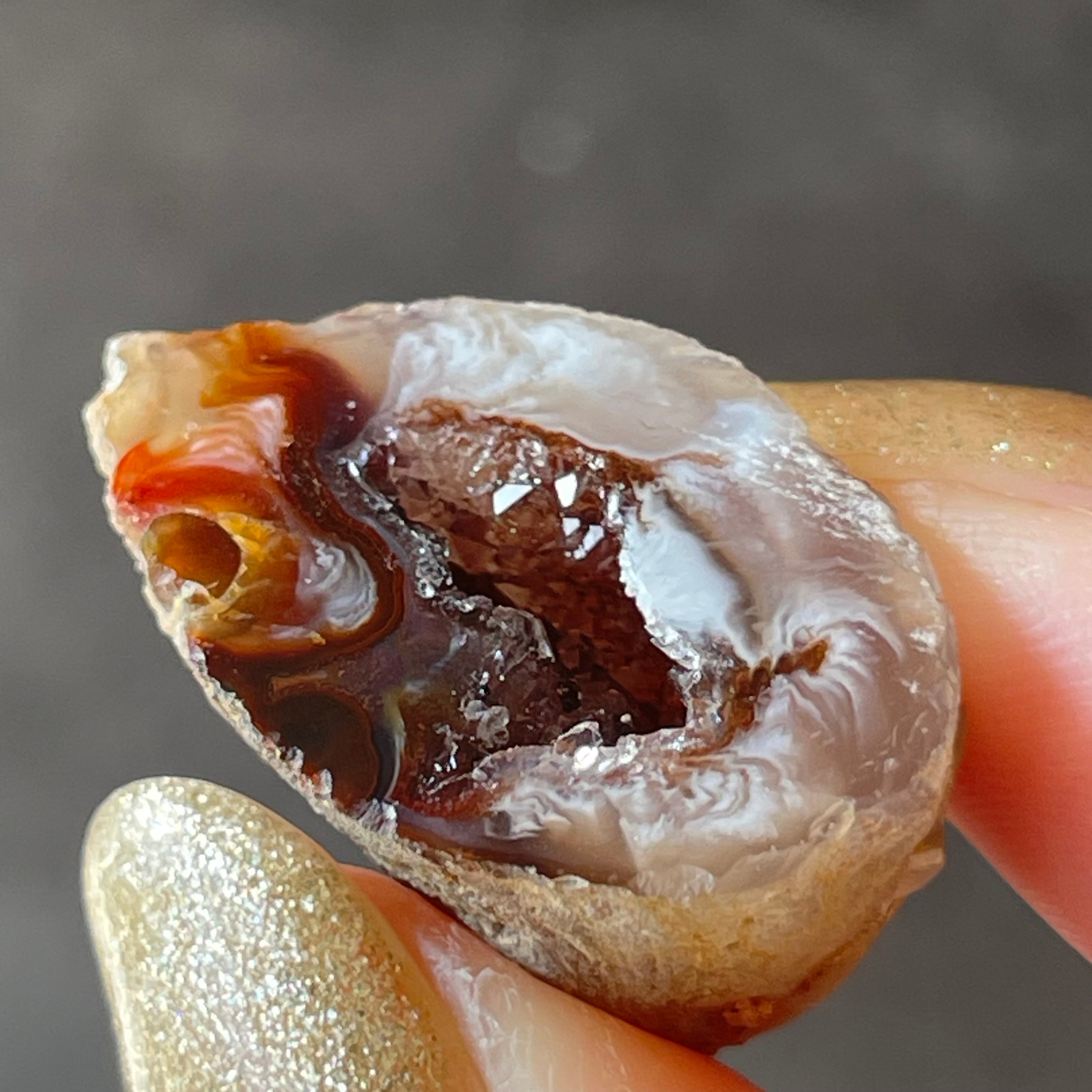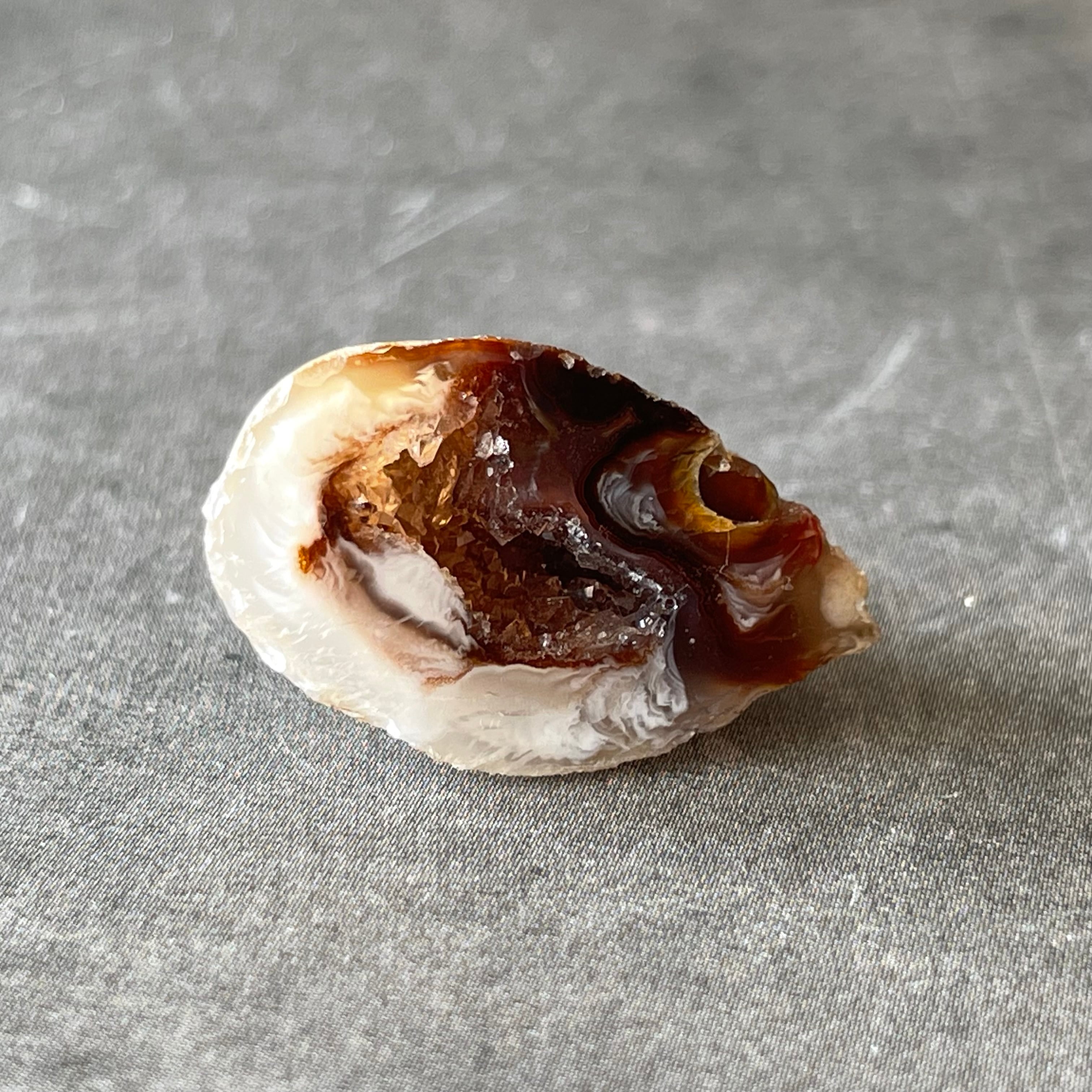 外側の滑らかな縞模様と、中を割ったときに現れるキラキラとした結晶のコントラストが魅力。