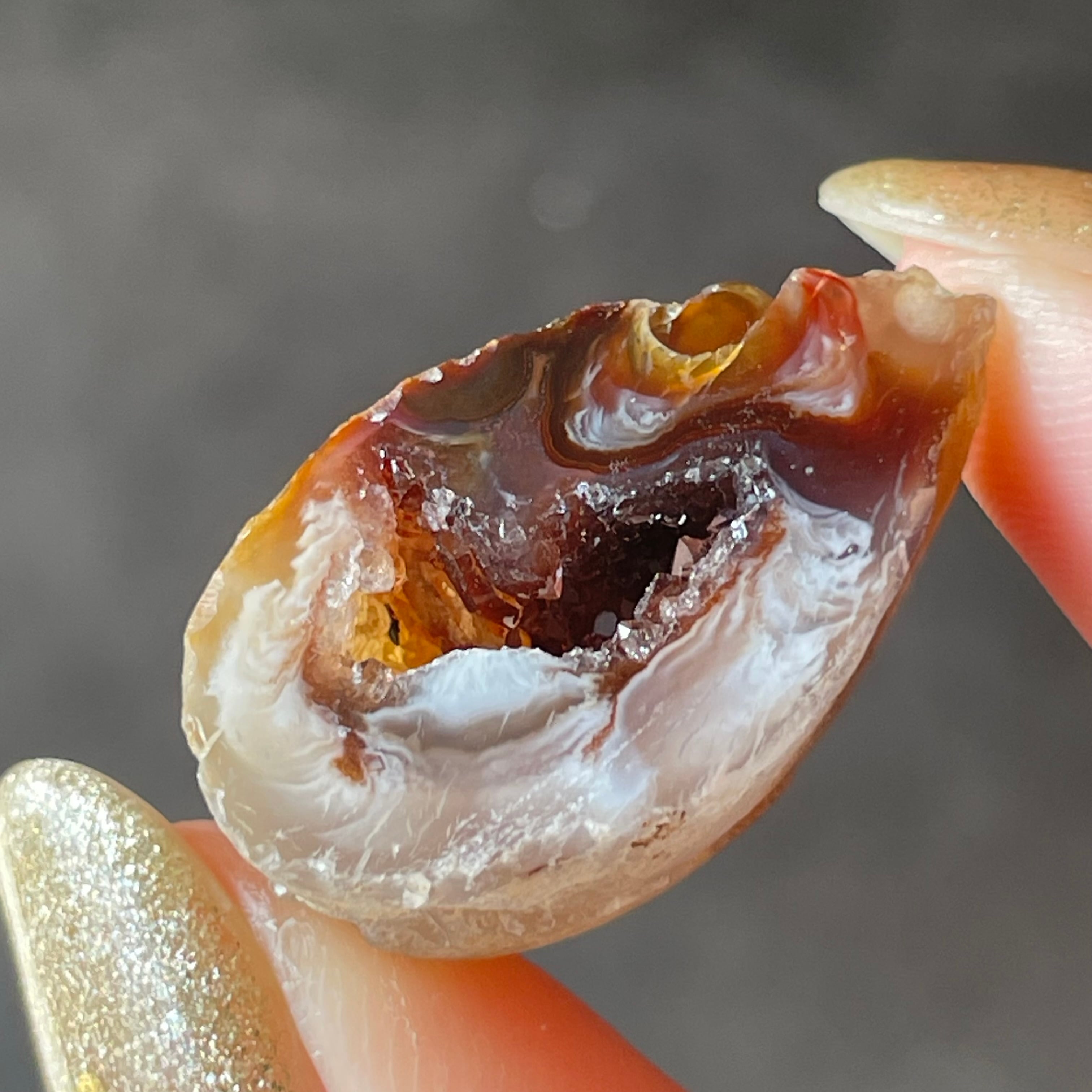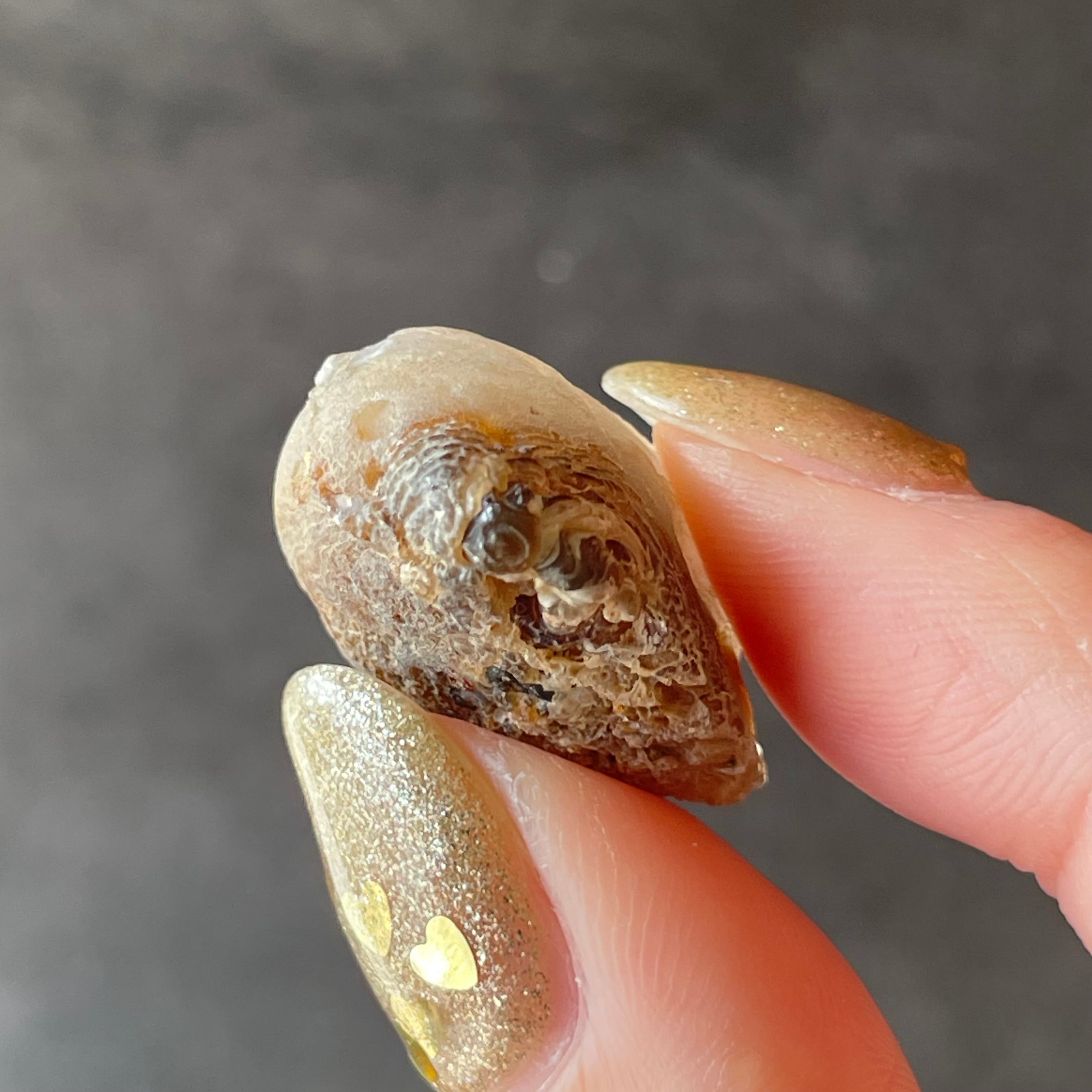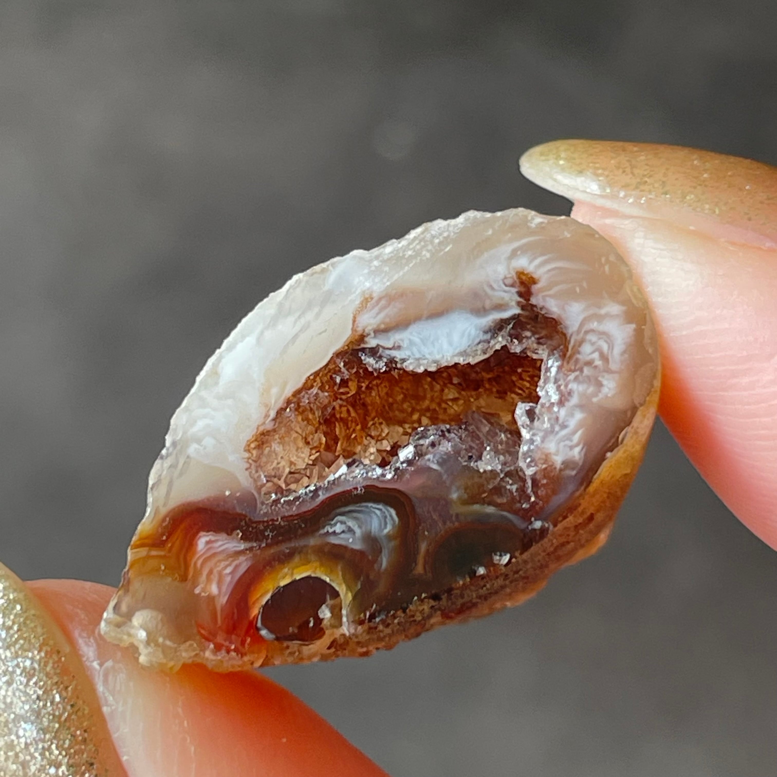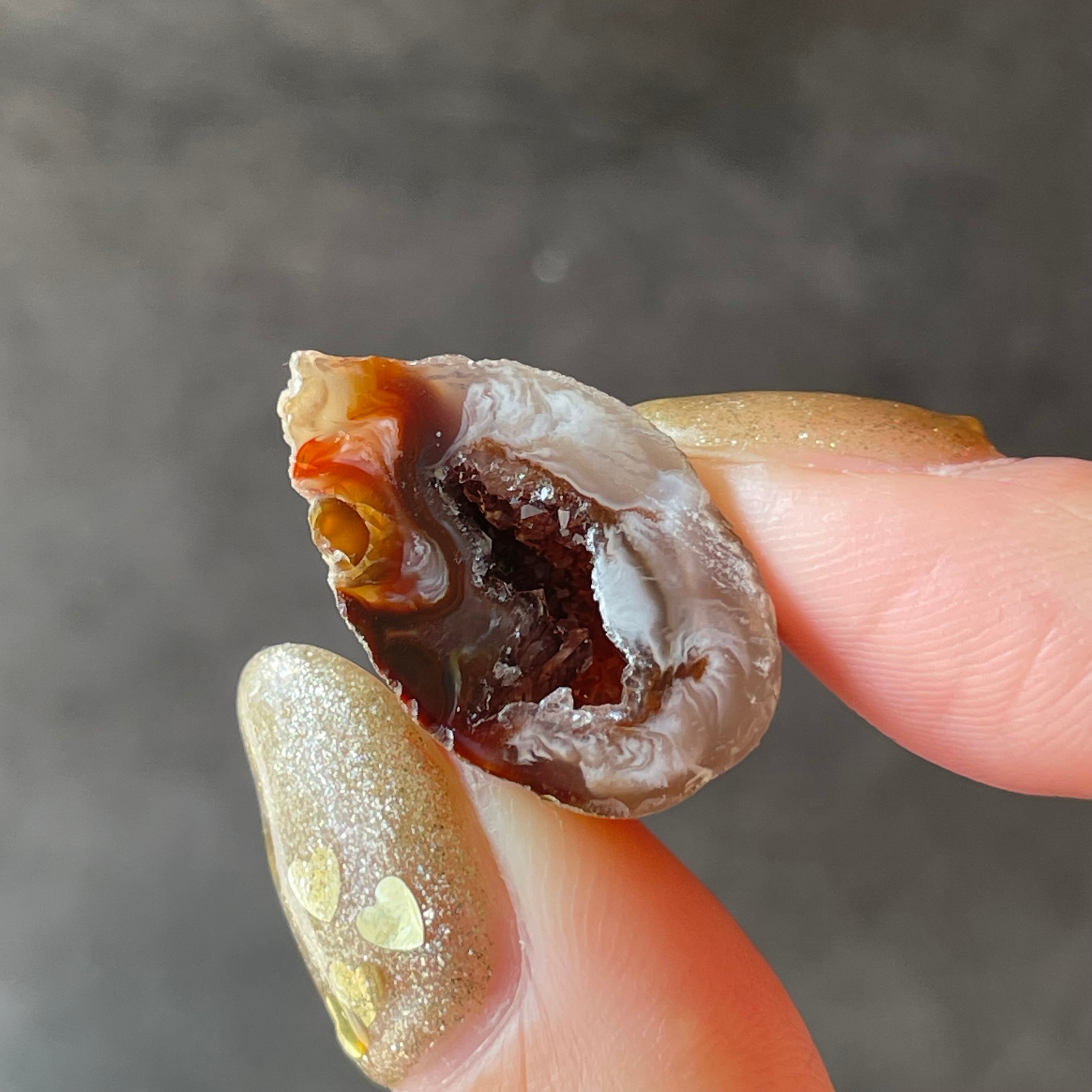 外側の滑らかな縞模様と、中を割ったときに現れるキラキラとした結晶のコントラストが魅力。