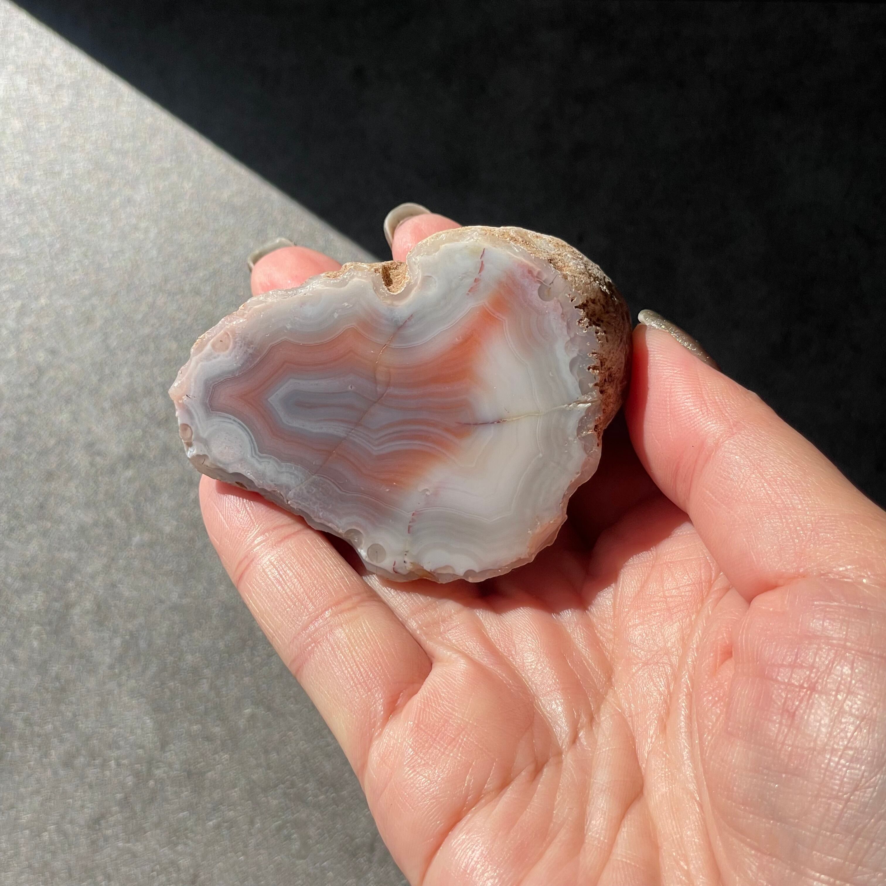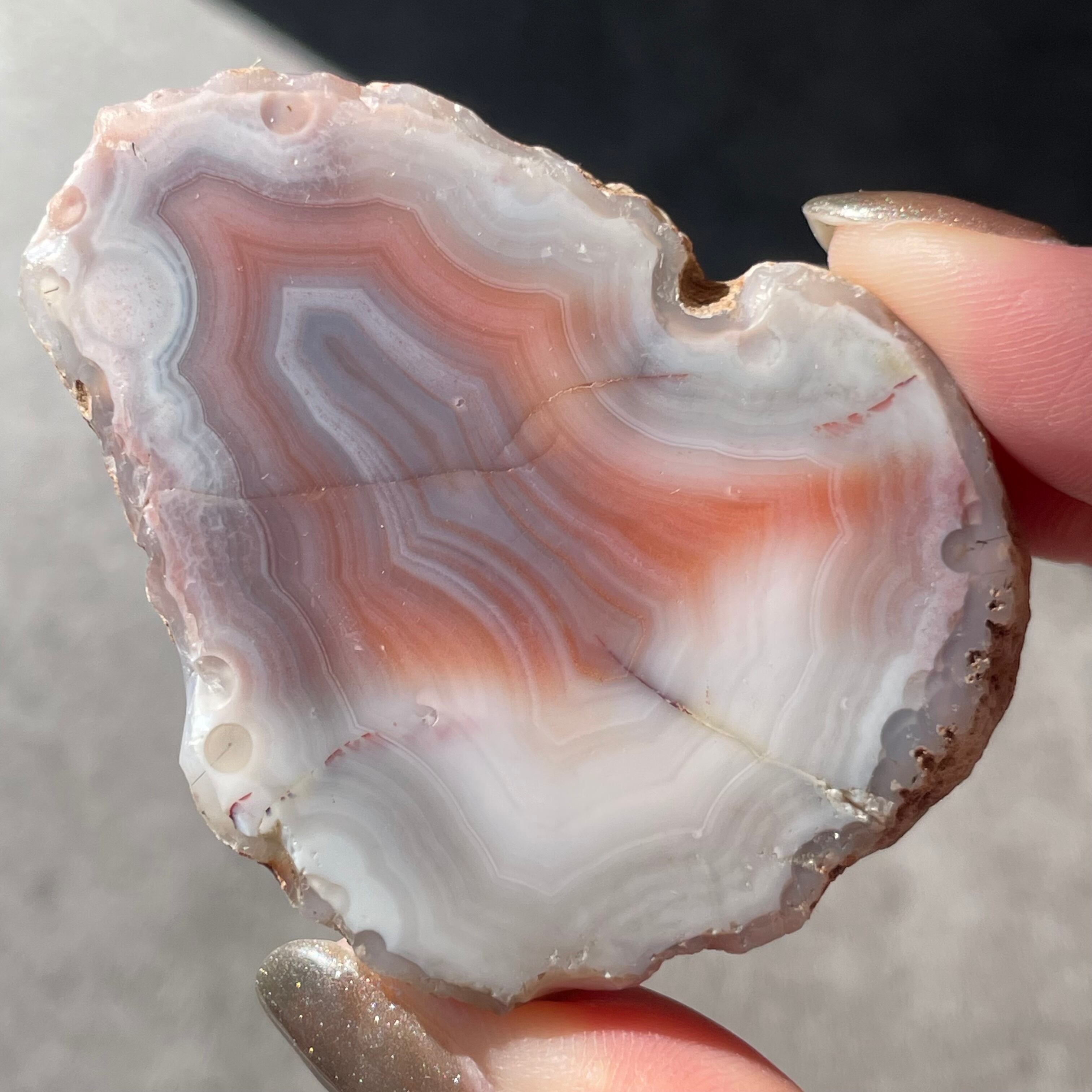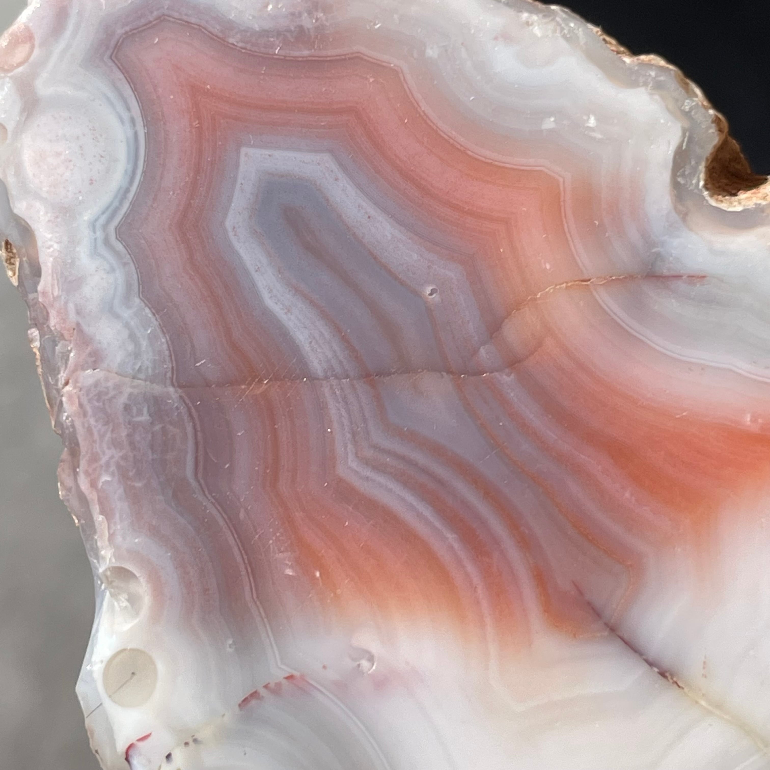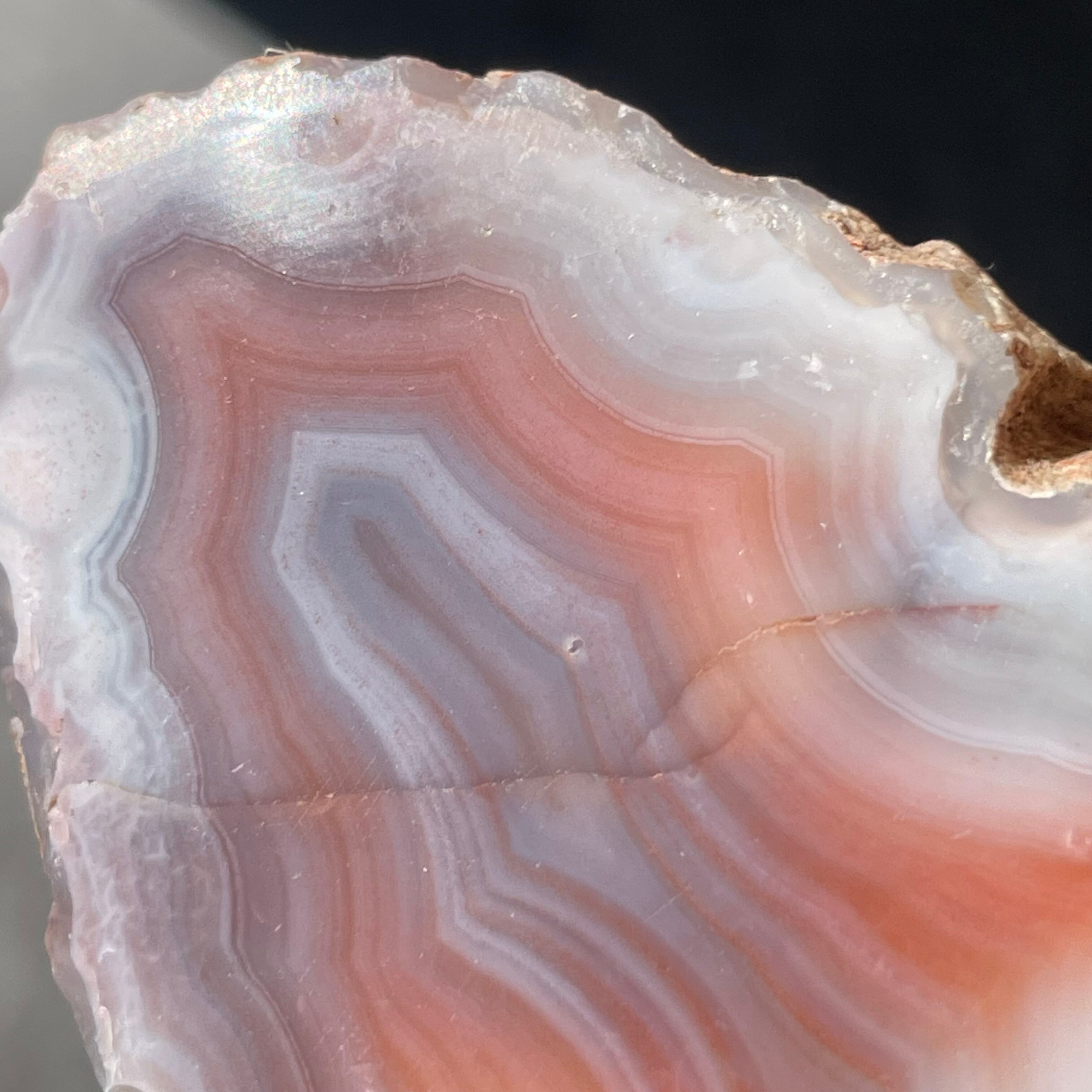 片面研磨により現れたやさしいピンク、アースカラー、サーモンピンクそしてミルキーホワイトのレイヤー。