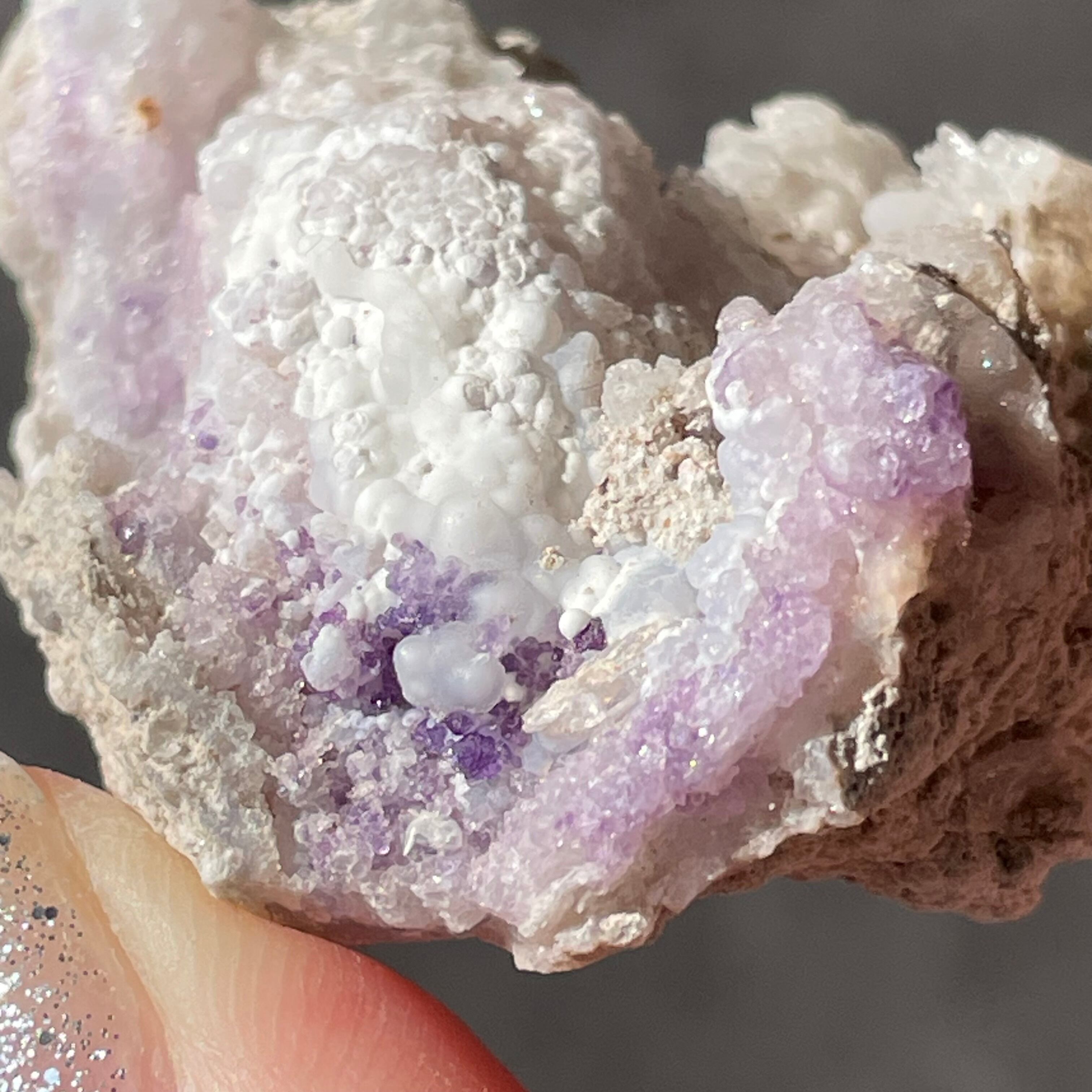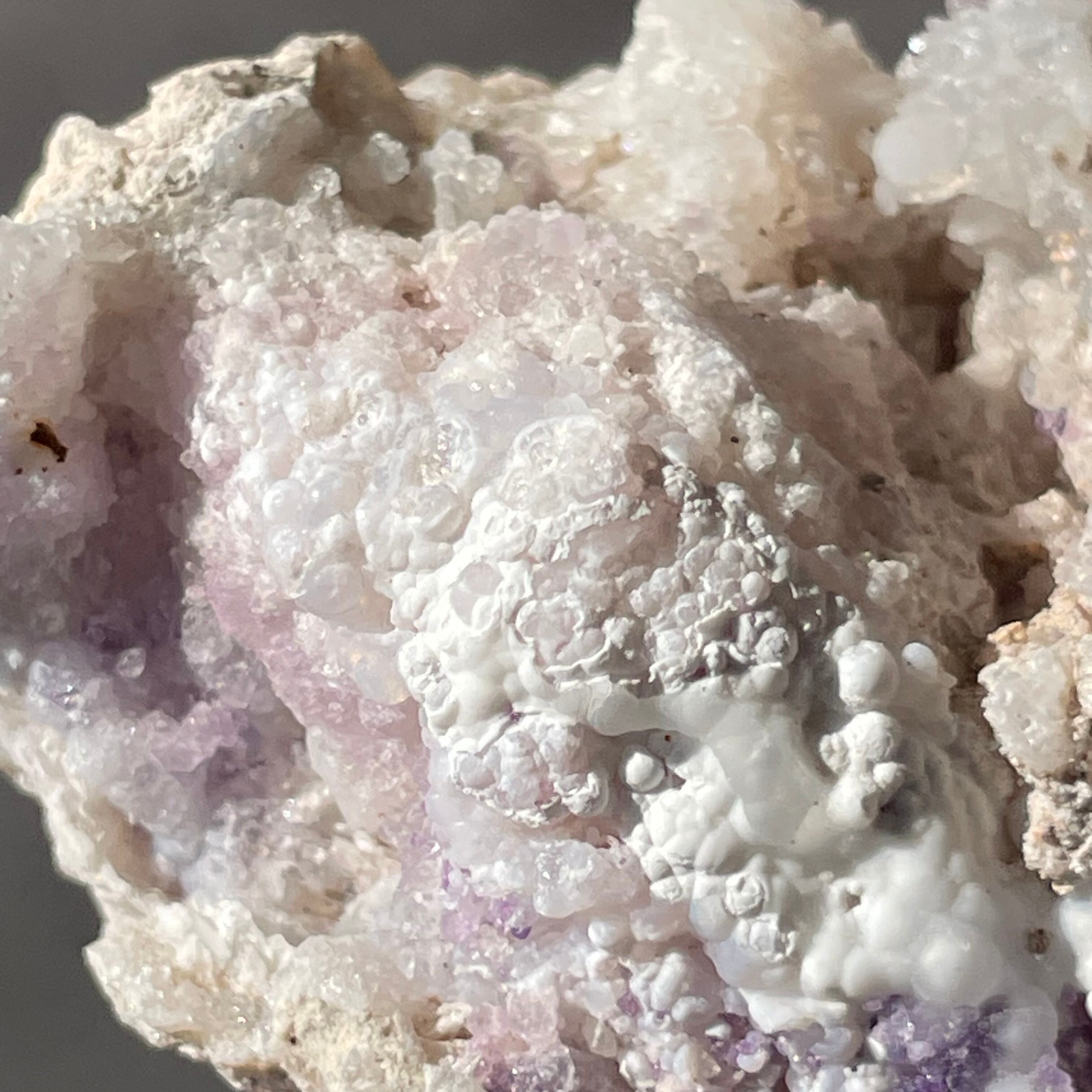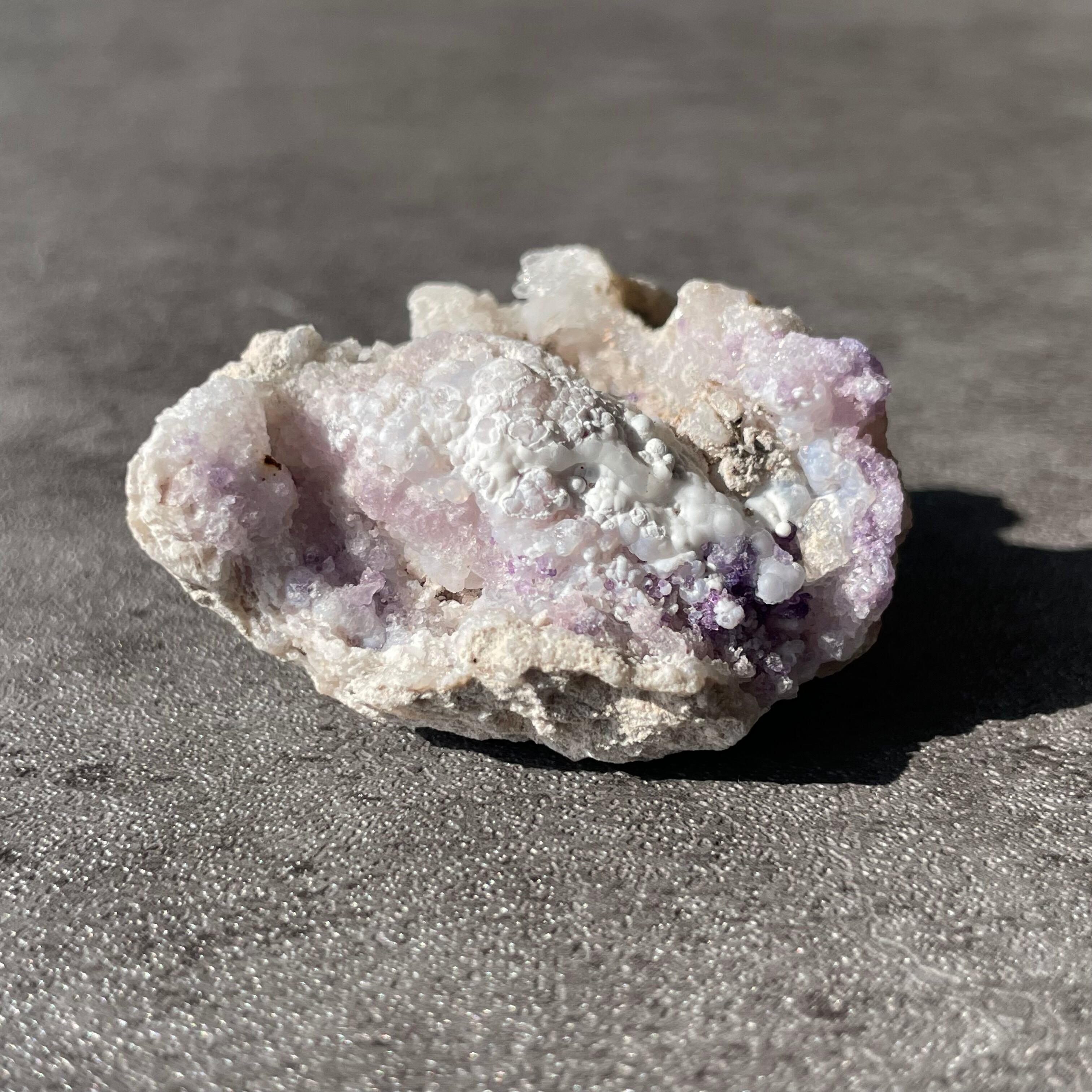 2021年に発見されたスピリットフラワーは紫色のフローライト、ブドウ状のカルセドニー、ドゥルージークォーツの結晶が織りなす素晴らしいコンビネーションです。
