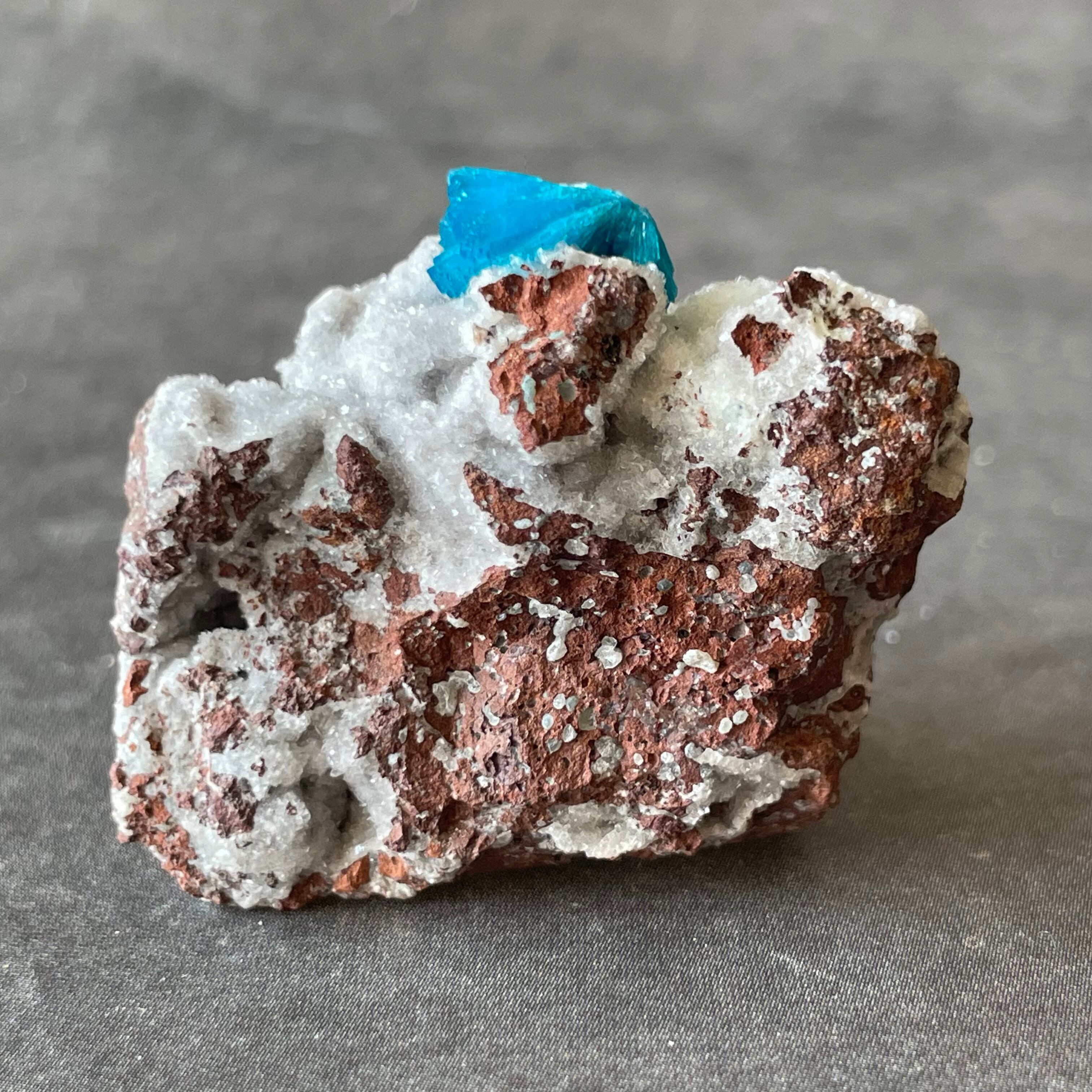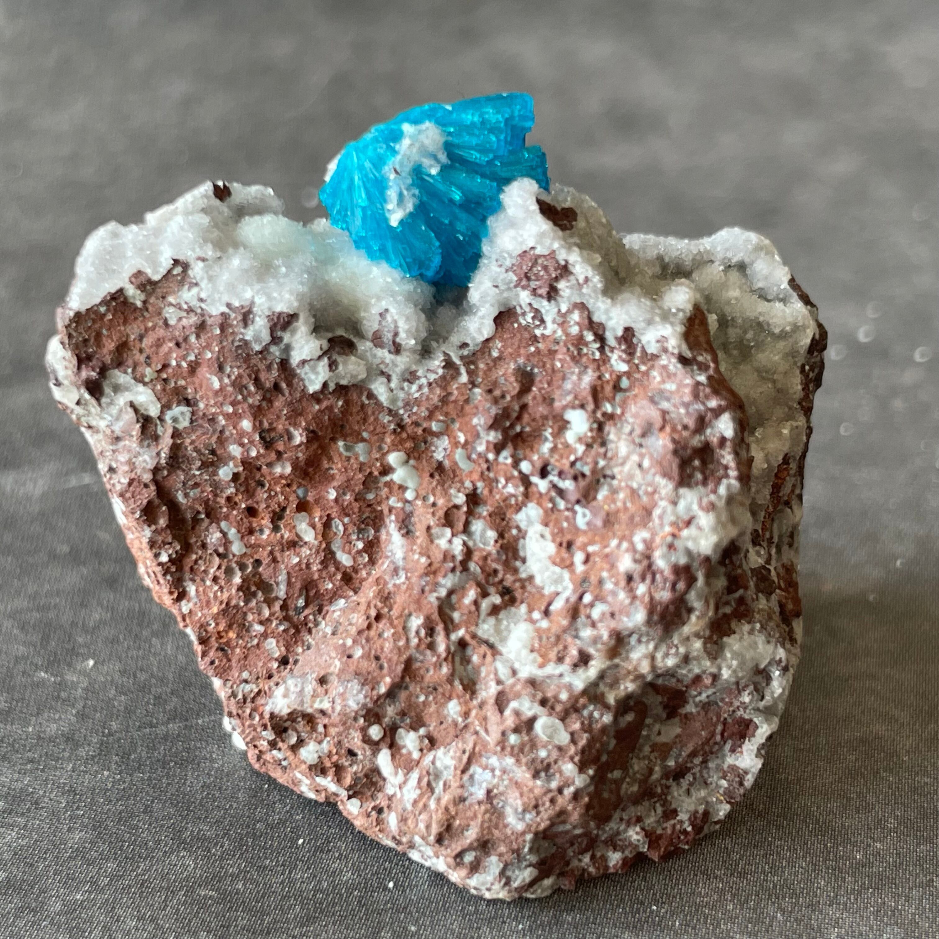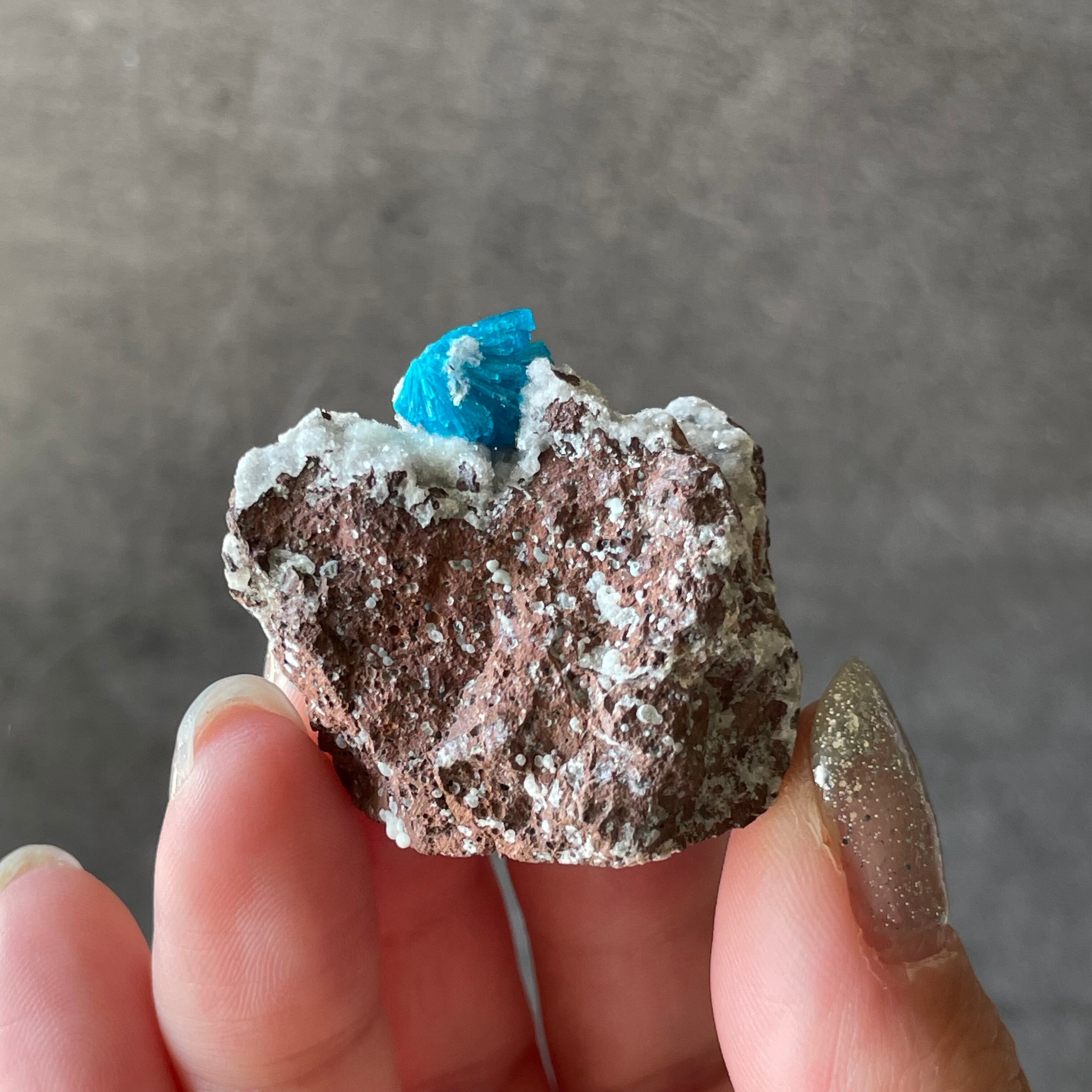 カバンサイトの原石は、鮮やかなブルーがひときわ目を引く神秘的な鉱物。放射状に広がる結晶はまるで花が咲いたような美しさで、母岩とのコントラストも魅力です。自然が生み出したアートのような存在感で、空間に爽やかさと個性を添えてくれます。